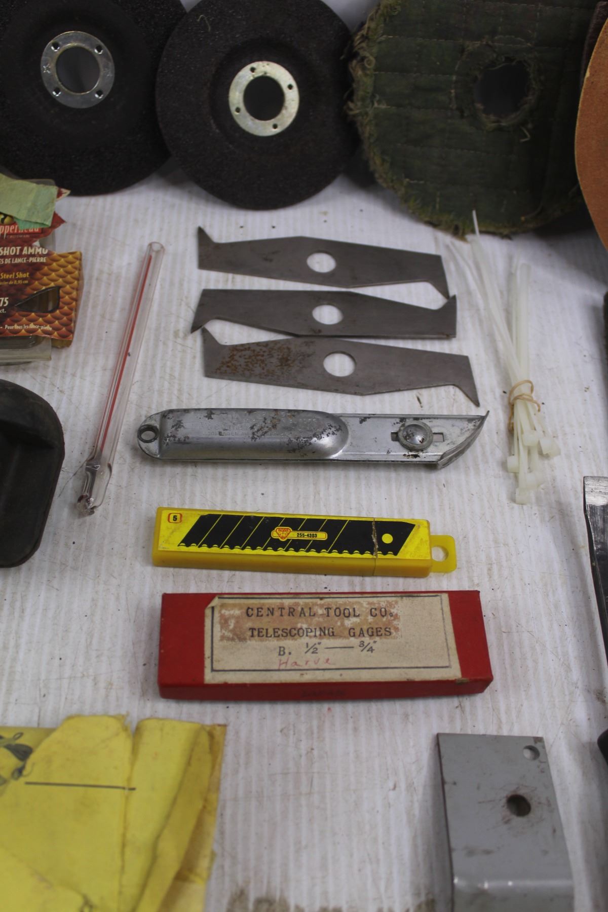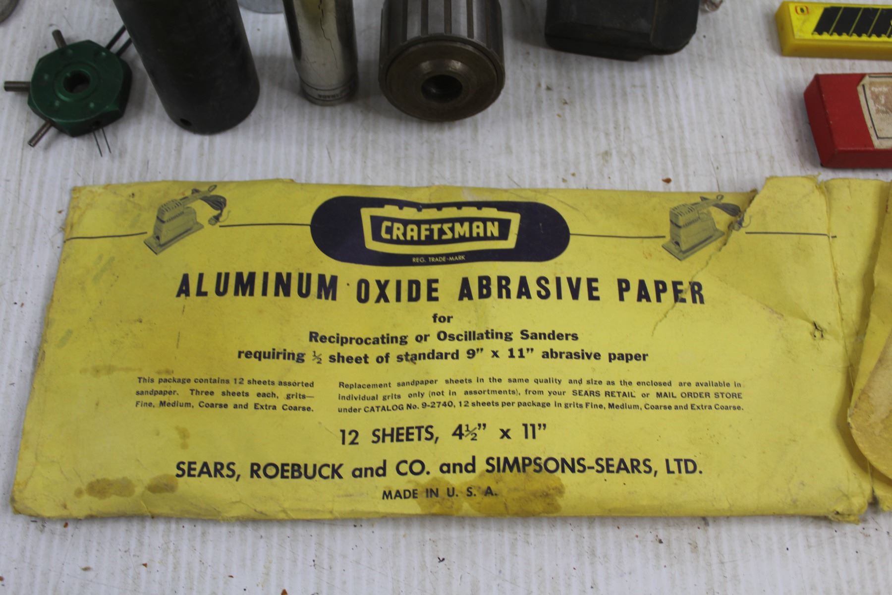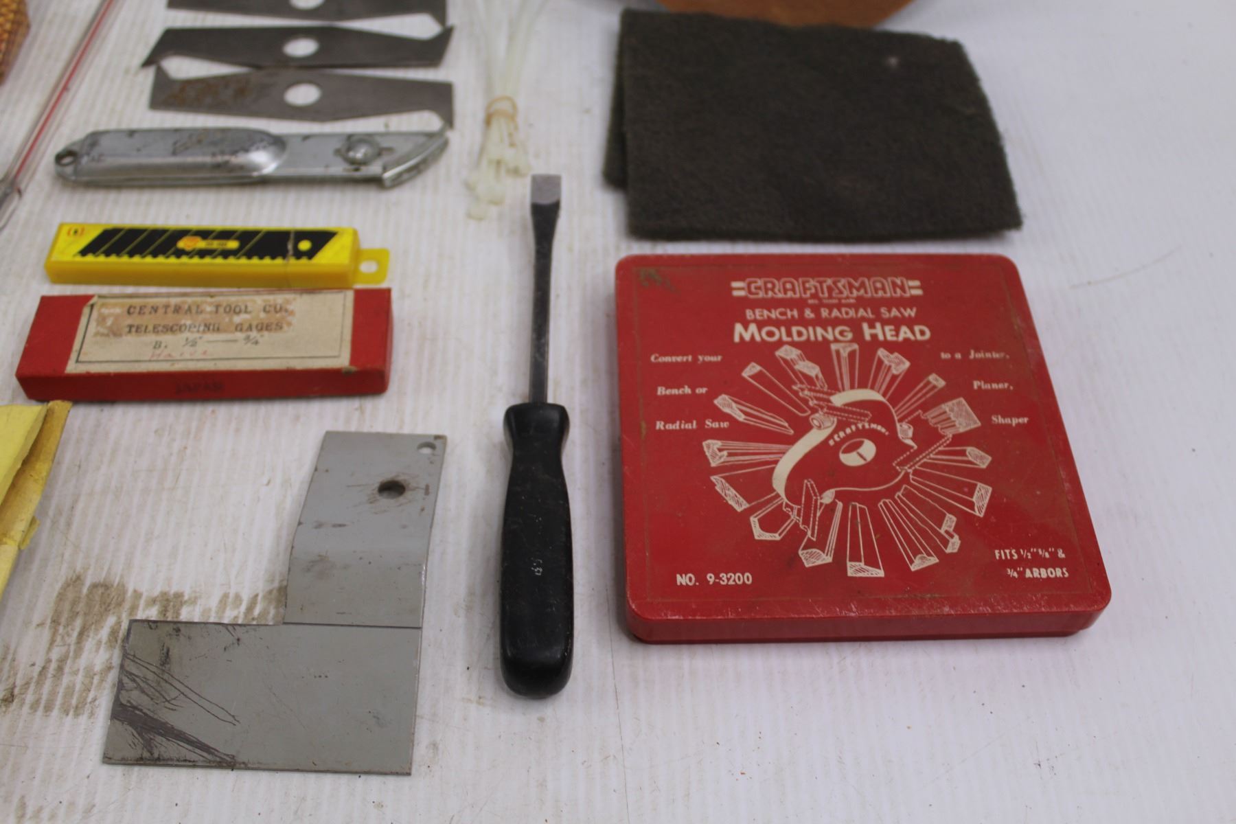 Craftsman Bench & Radial Saw Molding Head, Assorted Sanding Disks, Assorted Saw Blades, Abrasive Paper, Assorted Sockets, (3) Stanley Utility Hinges, Misc.