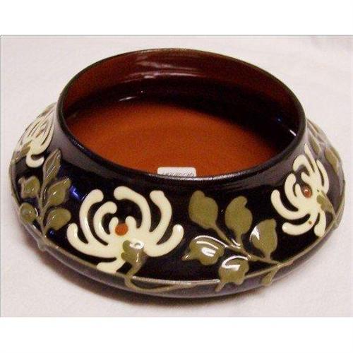 Vintage Germany earthenware cache pot in the Craftsman style, hand decorated with simplistic arts and crafts slip painted motif in earth tones. Highly glazed and very textural. Interior is high glazed rust tone.<p>Pot measures 5.25 inches wide by 1.75 inches high and rated to be in very good to near excellent condition. Red inkstamped Germany (script) underglaze, mold and decor design dates this piece ca 1920.