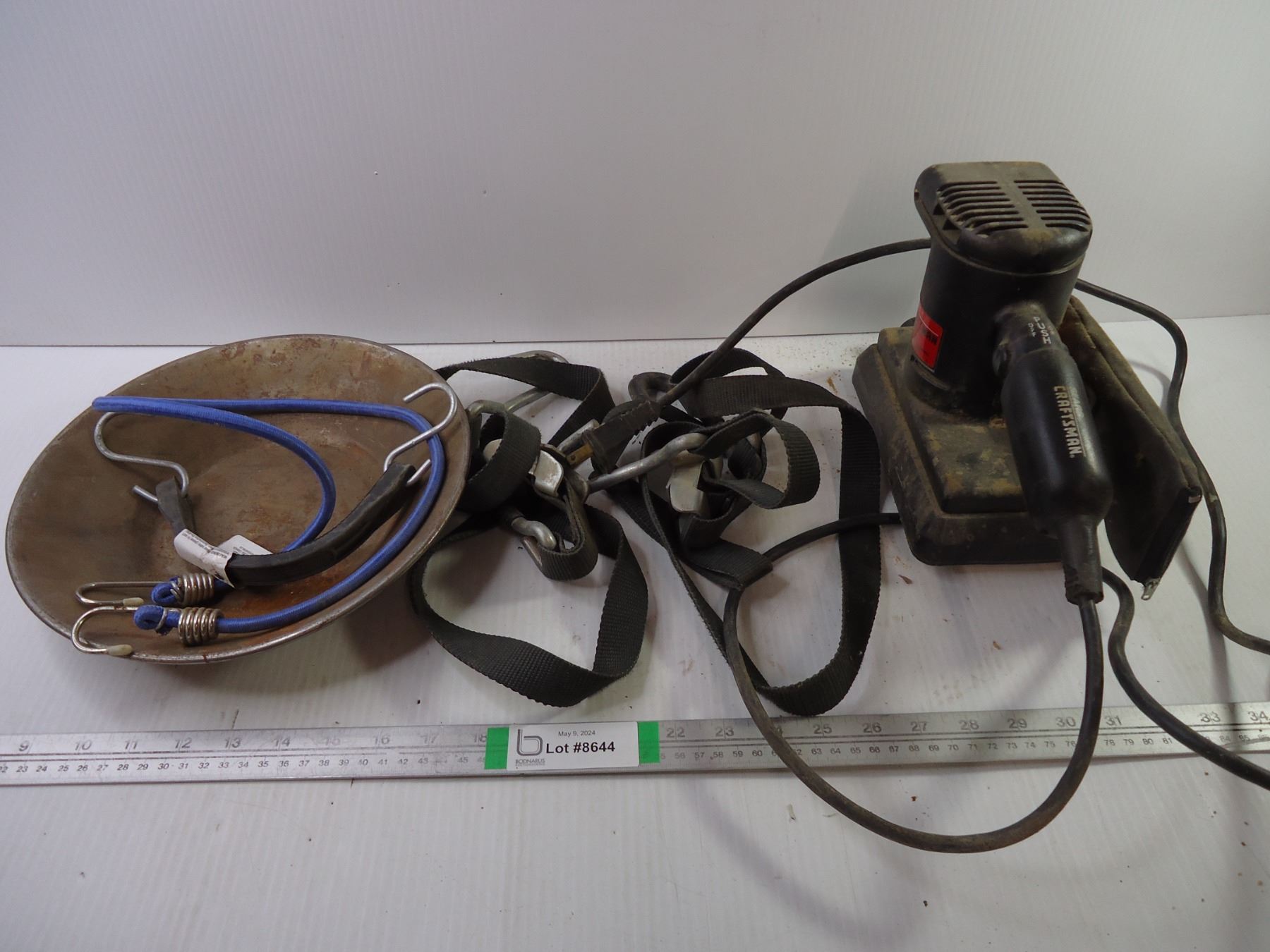 Craftsman Sander (does not power on) (2) Ratchets (2) Tie Straps and rusty dish