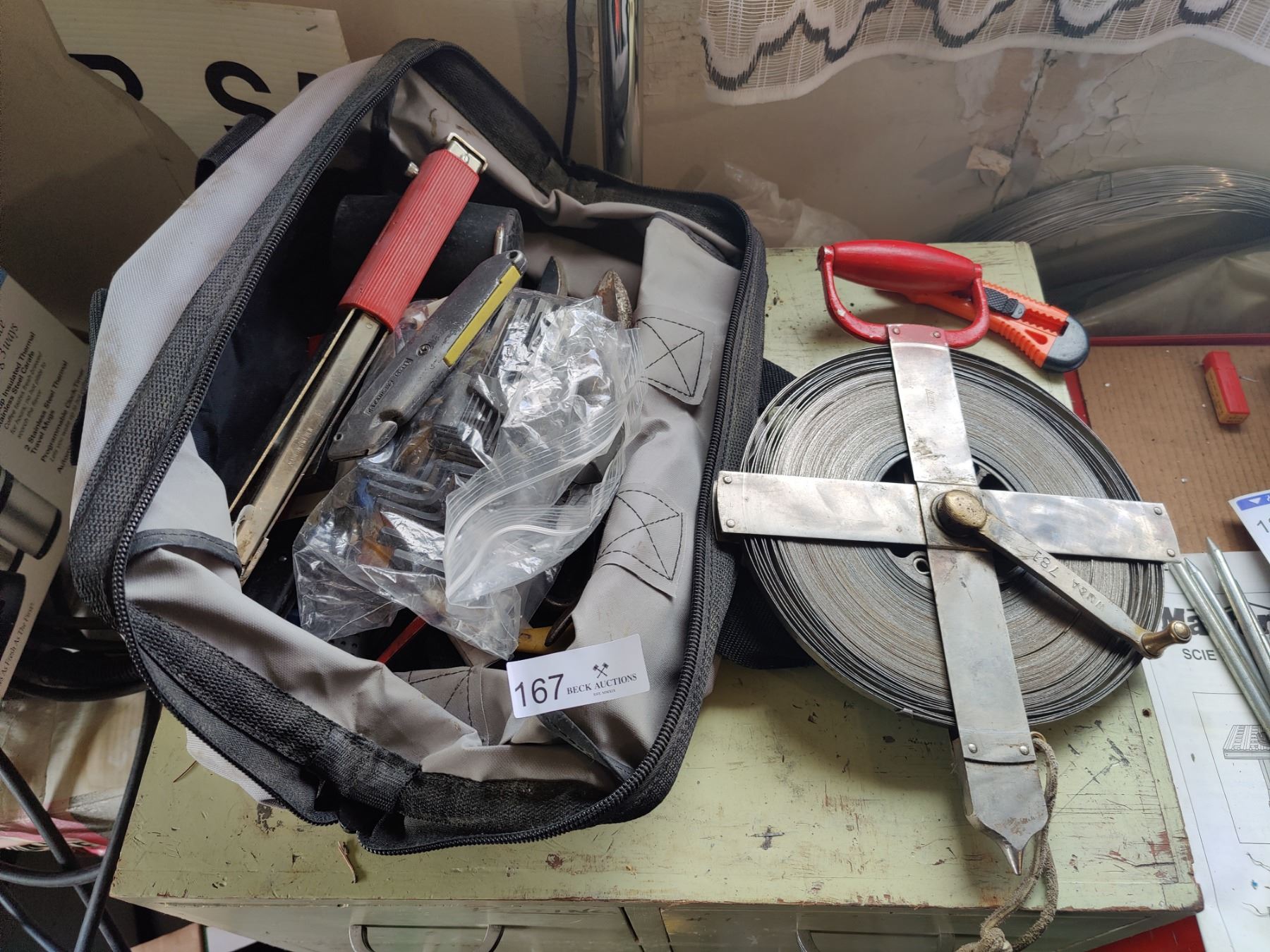 Soft tool bag filled with an assortment of hand tools. "Open Reel" measuring tape included.