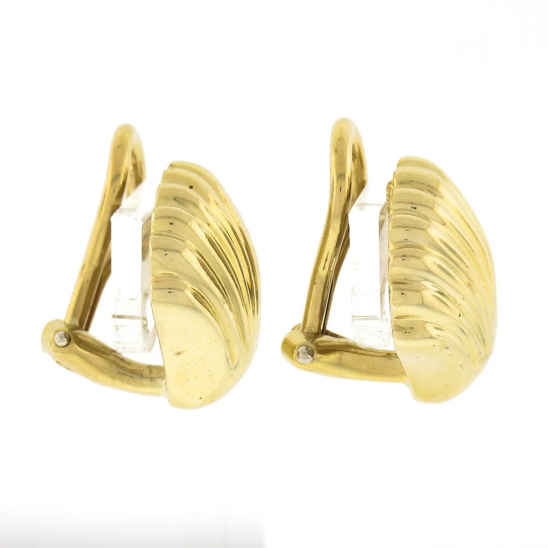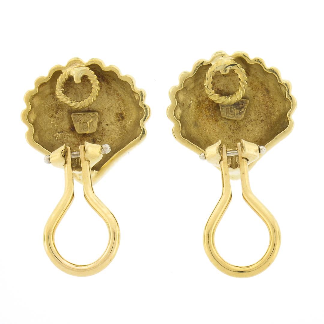 A solid 18k yellow gold shell clip on earrings by Craig Drake. The earrings measure approximately 14.4x14.5mm and weigh a total of 9.19 grams.