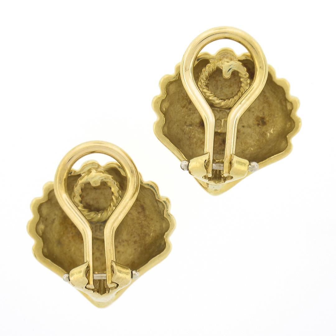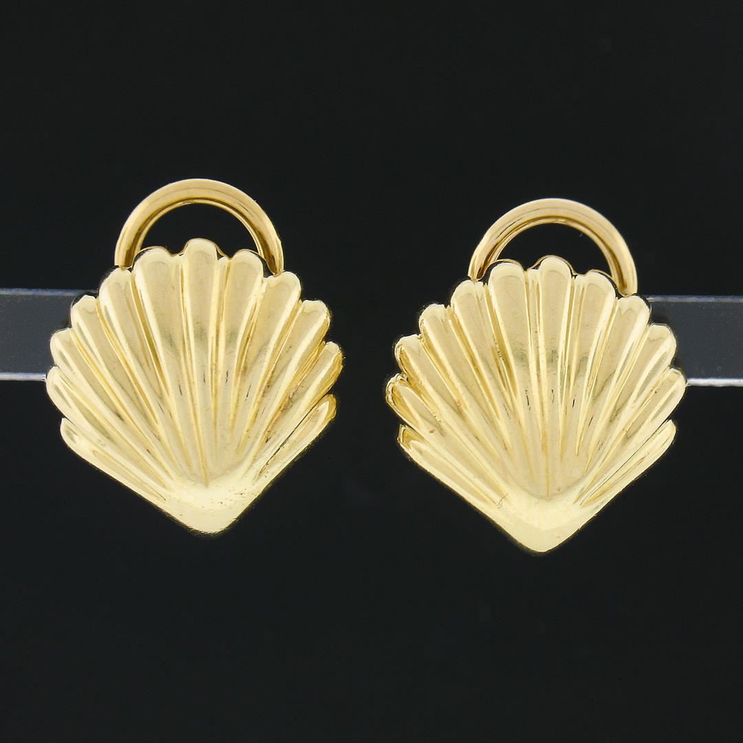 A solid 18k yellow gold shell clip on earrings by Craig Drake. The earrings measure approximately 14.4x14.5mm and weigh a total of 9.19 grams.