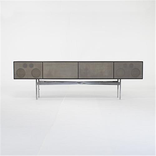 Cabinet features two drop-front doors enclosing original pair of JBL two-way stereo speakers and Thorens turntable. Sold with Macintosh MX-110 pre-amp/tuner.