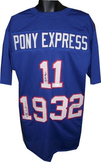 Initially, Dickerson shared carries with Craig James and Charles Waggoner, all three blue-chip recruits in 1979. Waggoner was hurt returning a kickoff their freshman season, leaving Dickerson and James to lead SMU's running attack, called the "Pony Express." Led by quarterback Lance McIlhenny, this team claimed a share of the 1981 college football Division 1-A national championship, based on the determination of the National Championship Foundation. Eric Dickerson, Craig James and Lance McIlhenny have hand signed this Southern Methodist Mustangs Blue Custom Pony Express Jersey. JSA Hologram and Certificate of Authenticity.