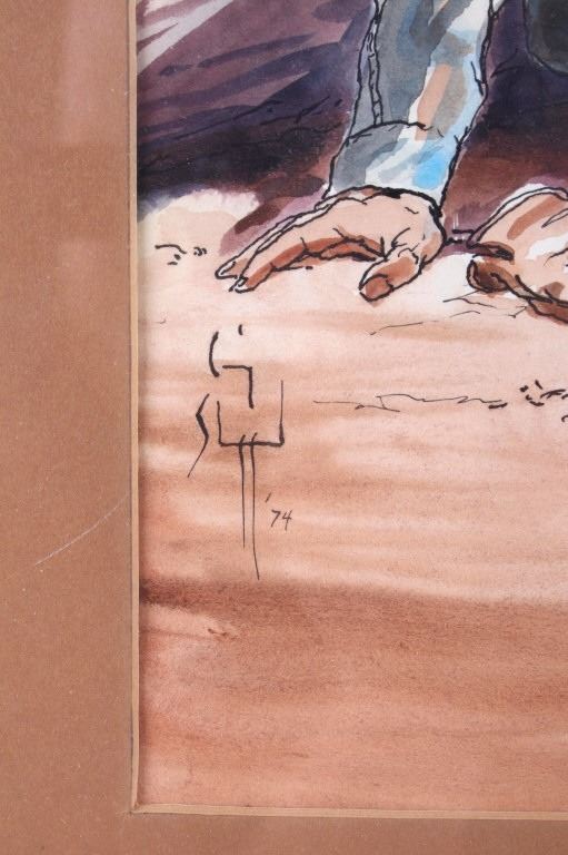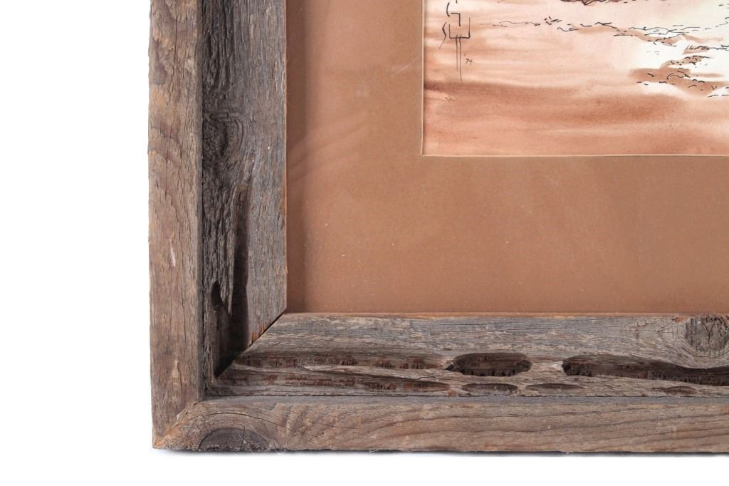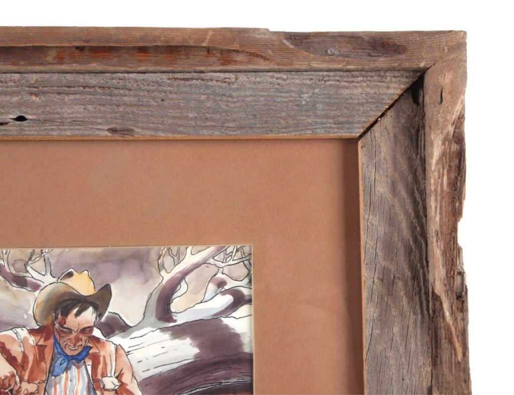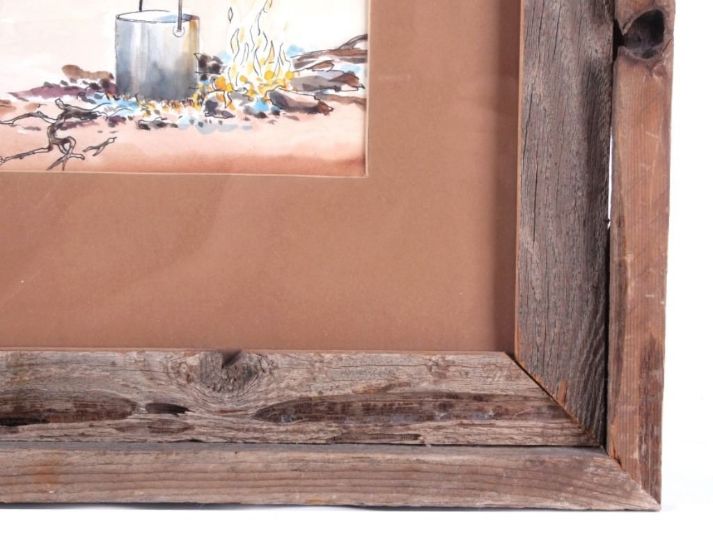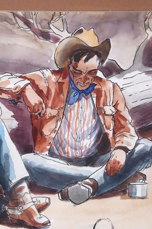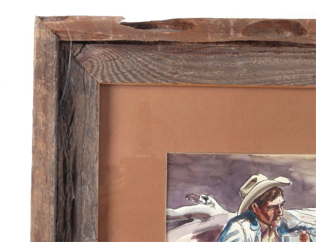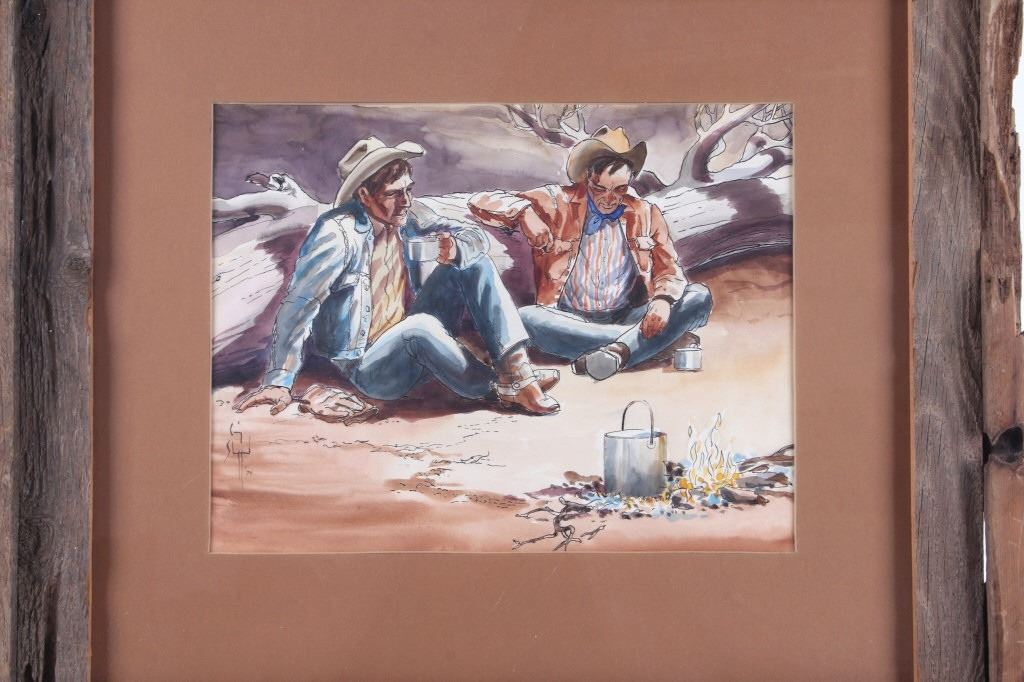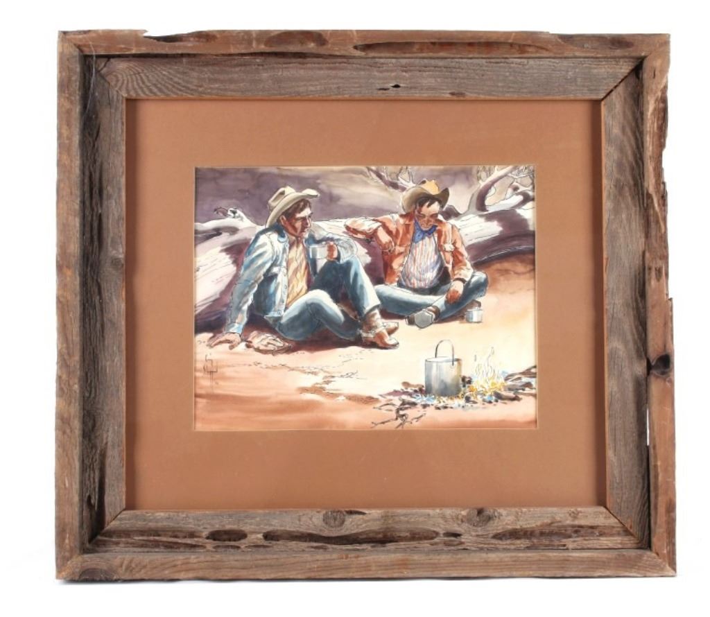 Featured in this lot is an Original Signed Craig Sheppard, "Coffee", 1974, a watercolor on paper in a rustic wood frame, signed and dated on bottom left corner. Provenance: the Owen D. Mort, Jr. Collection. Owen David Mort was an American engineer who amassed an impressive collection throughout his worldwide travels. His collection has included art, artifacts and other historical items from which he has donated to museums at the University of Utah and the Snite Museum of Art at the University of Notre Dame. Sheppard (1913-1978) is known primarily for his Western theme oil and watercolor paintings, though his range of graphic expression is diverse, and his work was acclaimed in numerous national and international exhibitions. He joined the Art Department at the University of Nevada in 1947, serving as the department chair before retiring in 1973. Sheppard's works are on display at the John & Geraldine Lilley Museum of Art at the University of Nevada, Reno. Sheppard learned to rope and to ride from his father. As a young man, he was a cowboy and rodeo rider, even riding bulls, and the cowboy mystique was to stick to him for the rest of his life. The Nevada desert was a challenge as well to this painter familiar with the brighter colors of the landscape of the Southwest. Free time away from the university found him exploring the Nevada desert landscape, learning to appreciate and paint its subtle colors, strong contrasts of light and dark, and, most of all, its immensity of space. Watercolor is the medium for which he is most noted and in which he worked exclusively toward the end of his life. A transparent medium, difficult if not impossible to rework or correct, it seemed to suit his temperament. Two cowboys sit resting against a fallen tree while drinking coffee, the pot on the hot coals while the fire alongside. It doesn't appear the cowboys are in any hurry to get back to work. Unlike other paintings of Nevada mountains or desert scenes, this is focused on an image of a hardworking Western cowboy life. The matted rustic wood frame is striking. Visible art measures 12.75"L x 9.75"W. The frame is 23"L x 20.75"W x 1.5"D.*