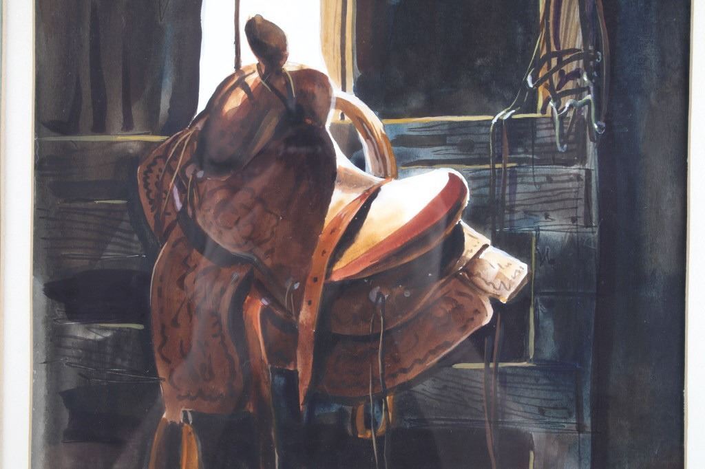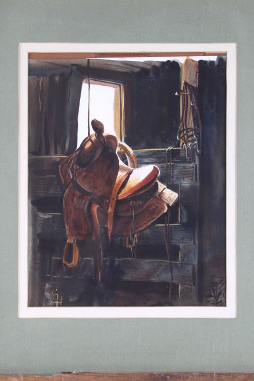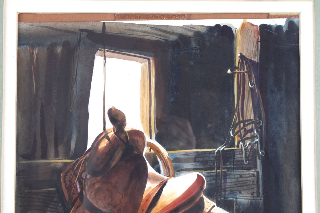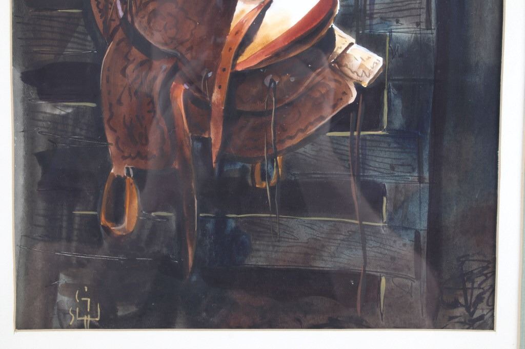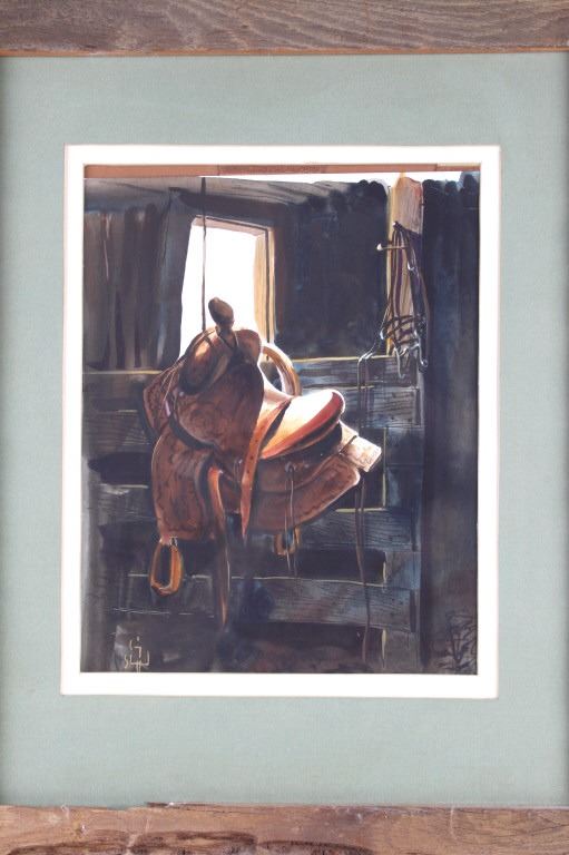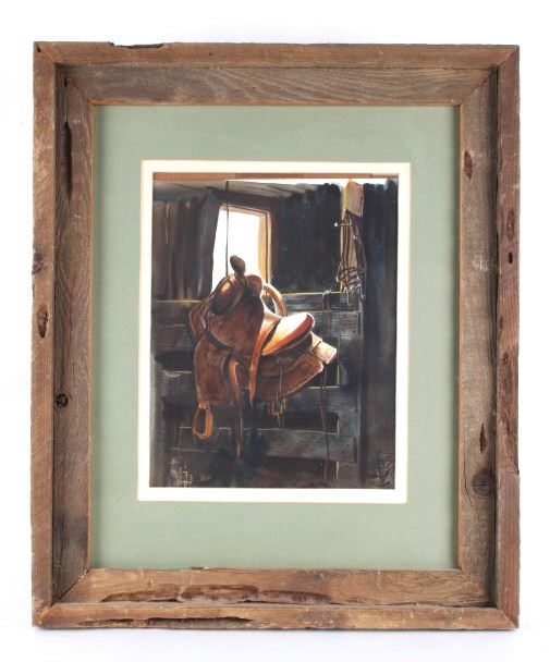 Featured in this lot is an Original Signed Craig Sheppard, "In The Shed", a watercolor on paper in a rustic wood frame, signed on bottom left corner. Provenance: the Owen D. Mort, Jr. Collection. Owen David Mort was an American engineer who amassed an impressive collection throughout his worldwide travels. His collection has included art, artifacts and other historical items from which he has donated to museums at the University of Utah and the Snite Museum of Art at the University of Notre Dame. Sheppard (1913-1978) is known primarily for his Western theme oil and watercolor paintings, though his range of graphic expression is diverse, and his work was acclaimed in numerous national and international exhibitions. He joined the Art Department at the University of Nevada in 1947, serving as the department chair before retiring in 1973. Sheppard's works are on display at the John & Geraldine Lilley Museum of Art at the University of Nevada, Reno. Sheppard learned to rope and to ride from his father. As a young man, he was a cowboy and rodeo rider, even riding bulls, and the cowboy mystique was to stick to him for the rest of his life. The Nevada desert was a challenge as well to this painter familiar with the brighter colors of the landscape of the Southwest. Free time away from the university found him exploring the Nevada desert landscape, learning to appreciate and paint its subtle colors, strong contrasts of light and dark, and, most of all, its immensity of space. Watercolor is the medium for which he is most noted and in which he worked exclusively toward the end of his life. A transparent medium, difficult if not impossible to rework or correct, it seemed to suit his temperament. Sheppard applies his style of contrasting colors and light focusing on a stamped with conchos Western saddle hanging in a tack shed. Bright sunshine spotlights the cantle and pommel, the stamped fender, saddle strings and skirt details still clearly visible in the shadows. A horse's bridle hangs above on a post; one can taste the Western lifestyle. The double matted rustic wood frame is striking. Visible art measures 13.25"L x 10.5"W; The frame is 24.5"L x 20.5"W x 1.5"D.*