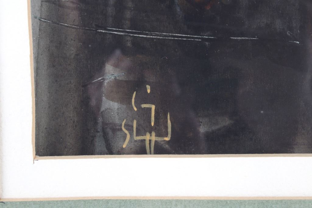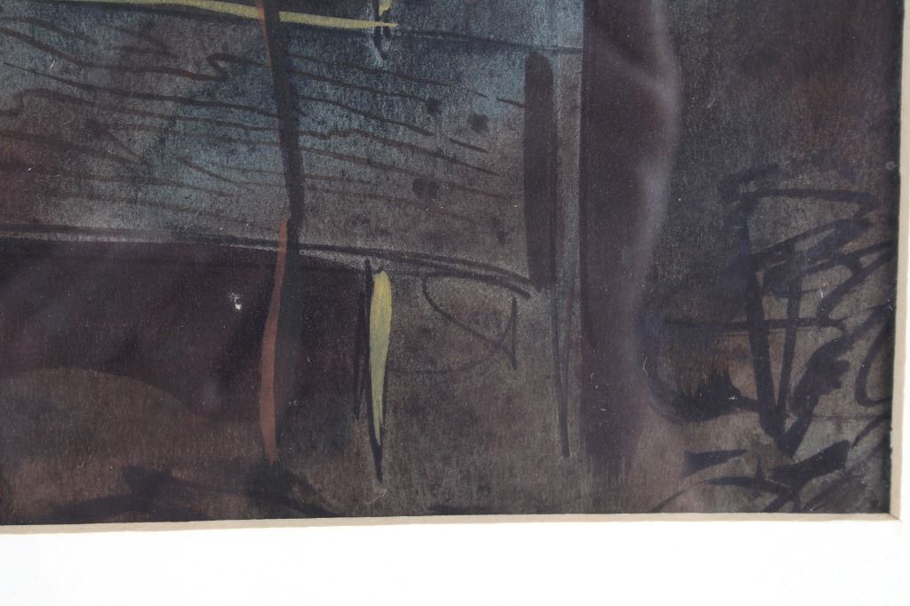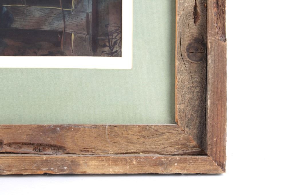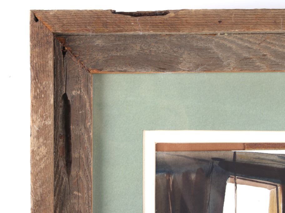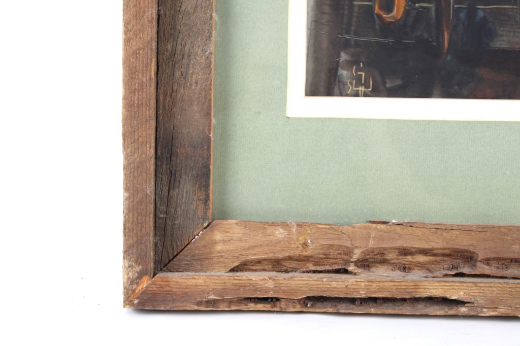 Featured in this lot is an Original Signed Craig Sheppard, "In The Shed", a watercolor on paper in a rustic wood frame, signed on bottom left corner. Provenance: the Owen D. Mort, Jr. Collection. Owen David Mort was an American engineer who amassed an impressive collection throughout his worldwide travels. His collection has included art, artifacts and other historical items from which he has donated to museums at the University of Utah and the Snite Museum of Art at the University of Notre Dame. Sheppard (1913-1978) is known primarily for his Western theme oil and watercolor paintings, though his range of graphic expression is diverse, and his work was acclaimed in numerous national and international exhibitions. He joined the Art Department at the University of Nevada in 1947, serving as the department chair before retiring in 1973. Sheppard's works are on display at the John & Geraldine Lilley Museum of Art at the University of Nevada, Reno. Sheppard learned to rope and to ride from his father. As a young man, he was a cowboy and rodeo rider, even riding bulls, and the cowboy mystique was to stick to him for the rest of his life. The Nevada desert was a challenge as well to this painter familiar with the brighter colors of the landscape of the Southwest. Free time away from the university found him exploring the Nevada desert landscape, learning to appreciate and paint its subtle colors, strong contrasts of light and dark, and, most of all, its immensity of space. Watercolor is the medium for which he is most noted and in which he worked exclusively toward the end of his life. A transparent medium, difficult if not impossible to rework or correct, it seemed to suit his temperament. Sheppard applies his style of contrasting colors and light focusing on a stamped with conchos Western saddle hanging in a tack shed. Bright sunshine spotlights the cantle and pommel, the stamped fender, saddle strings and skirt details still clearly visible in the shadows. A horse's bridle hangs above on a post; one can taste the Western lifestyle. The double matted rustic wood frame is striking. Visible art measures 13.25"L x 10.5"W; The frame is 24.5"L x 20.5"W x 1.5"D.*
