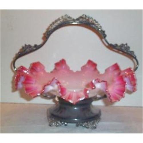 This very hard-to-find and quite lovely Cranberry or Pink Cased Ruffled Edge Brides Basket and its silverplate holder is in SUPERIOR condition with no chips, cracks, or dings and no repairs. The basket measures 12" in diameter and stands a very stately 12.50" tall to the top of its silverplated handle.