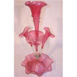 Cranberry Epergne with applied glass decoration. 21" tall.