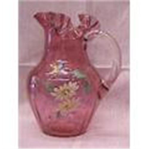 Weare offering this beautiful antique Cranberry color Fenton Pitcher with Enamel painting of flowers and birds and bees on with ruffled top and clear color handle in perfect condition. It is not marked. H:10" - Widest:8"