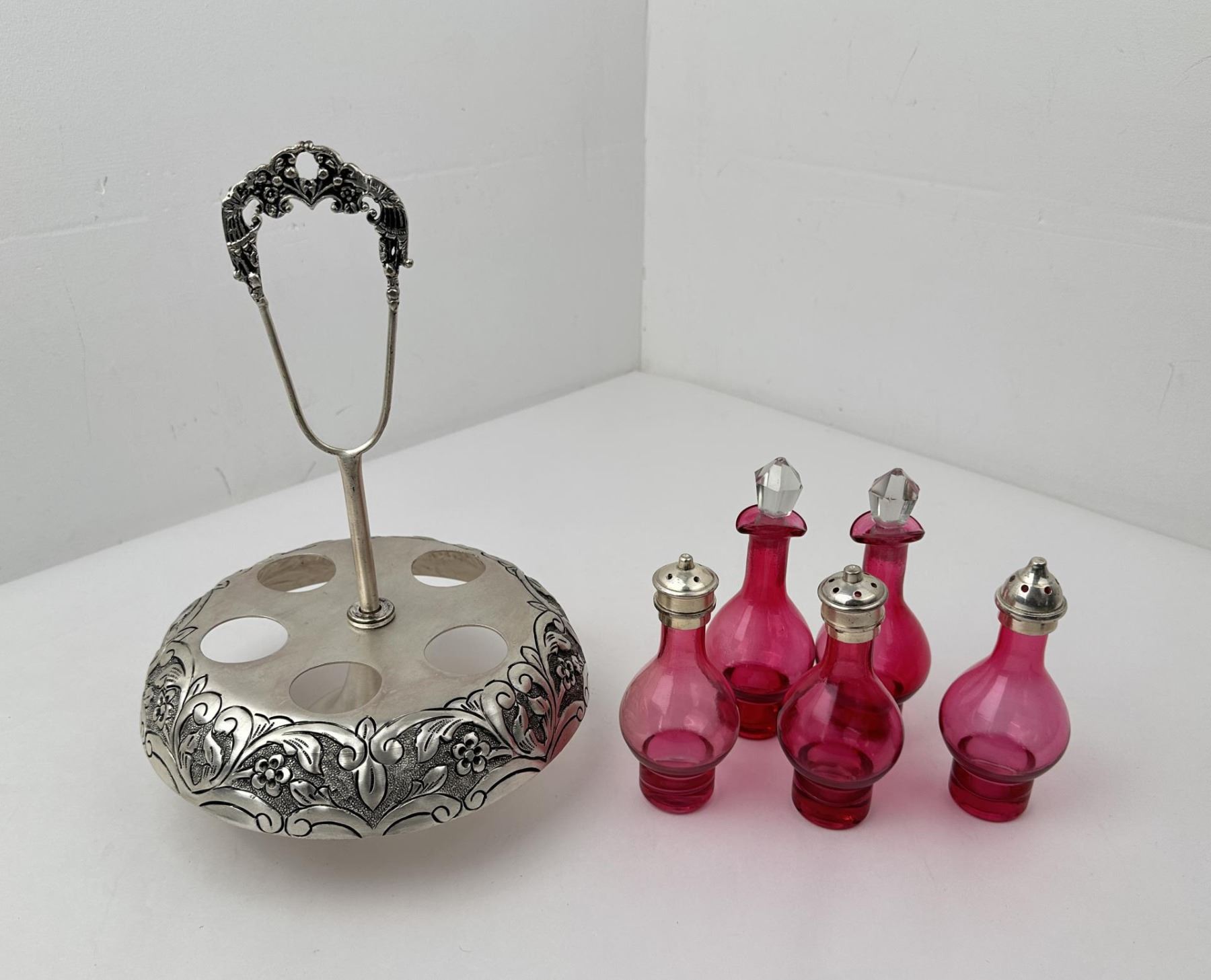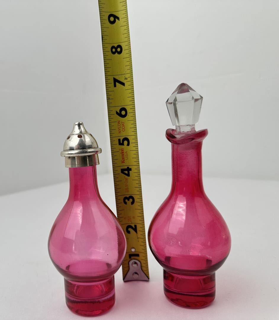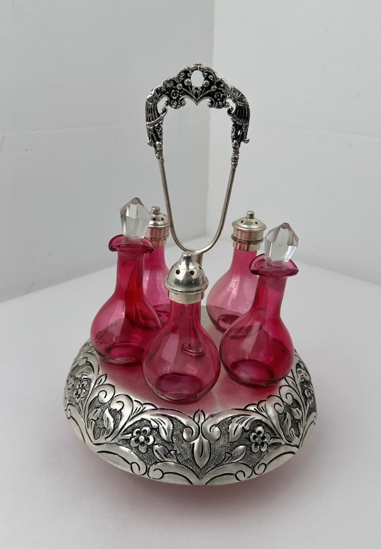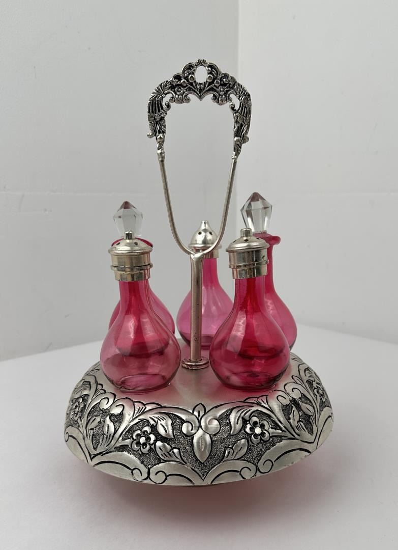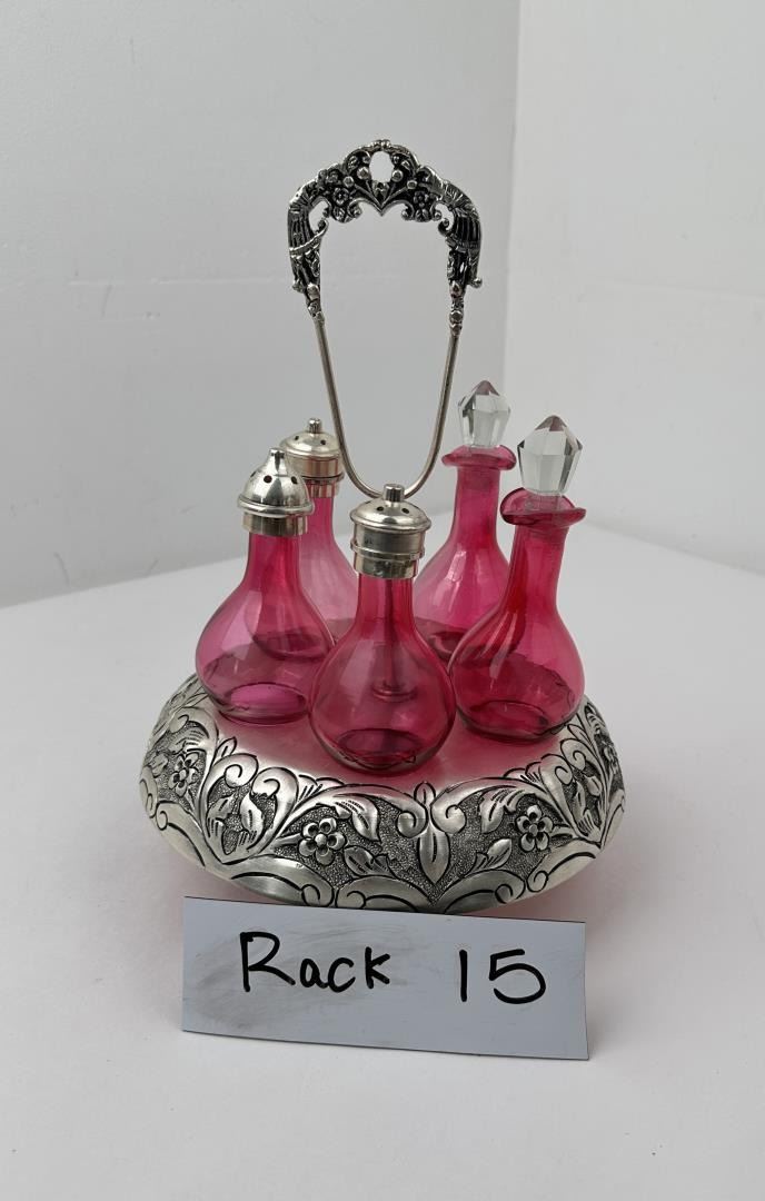 Caddy measures 12 1/4" tall by 9" in diameter. Cruets measures 6 1/2" to the top of the stopper.