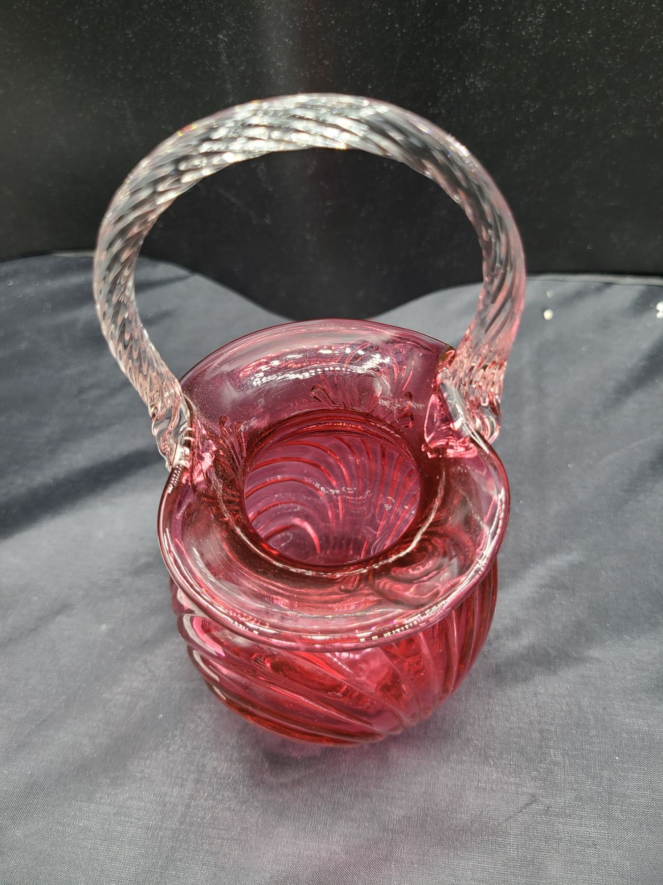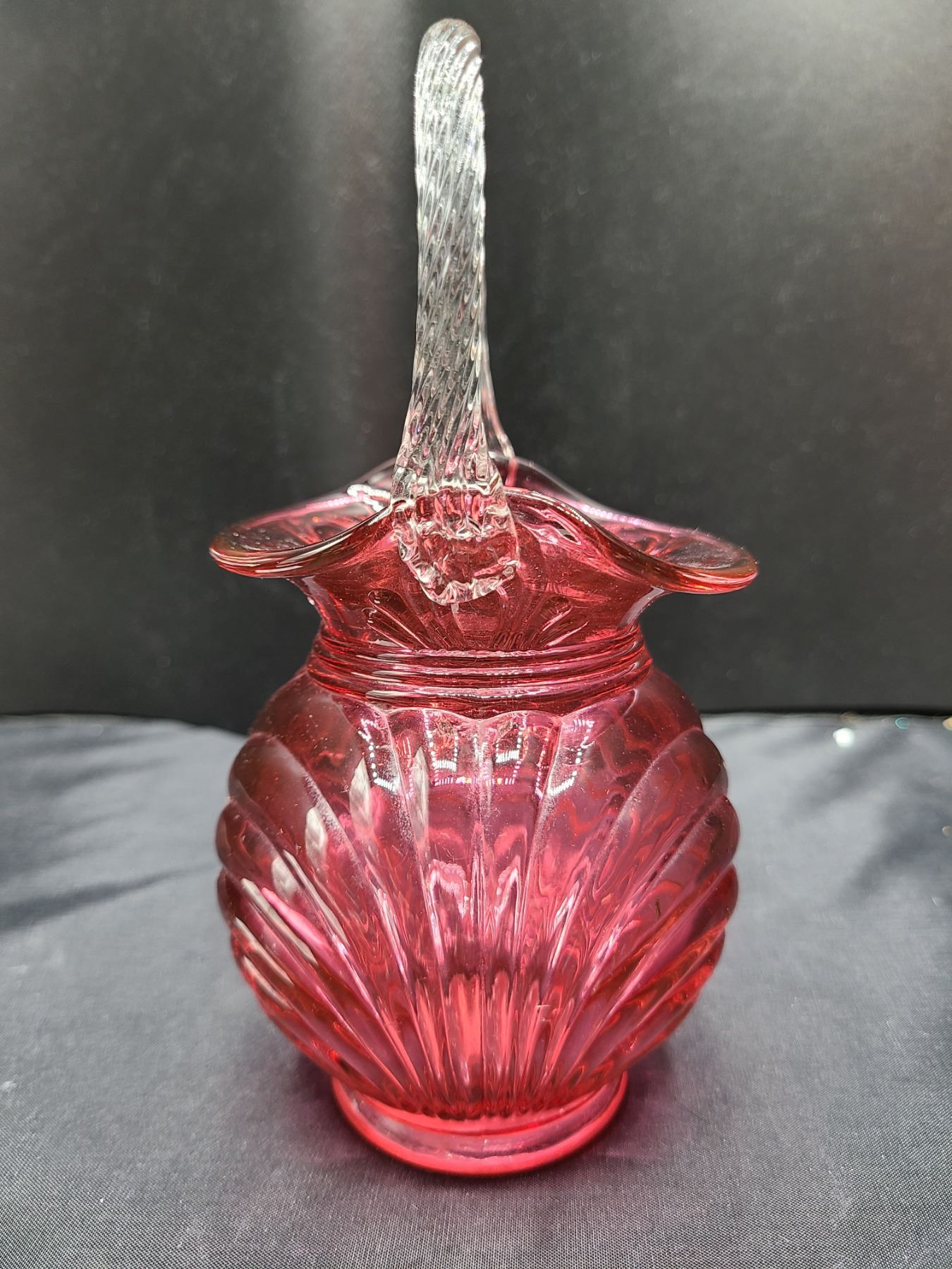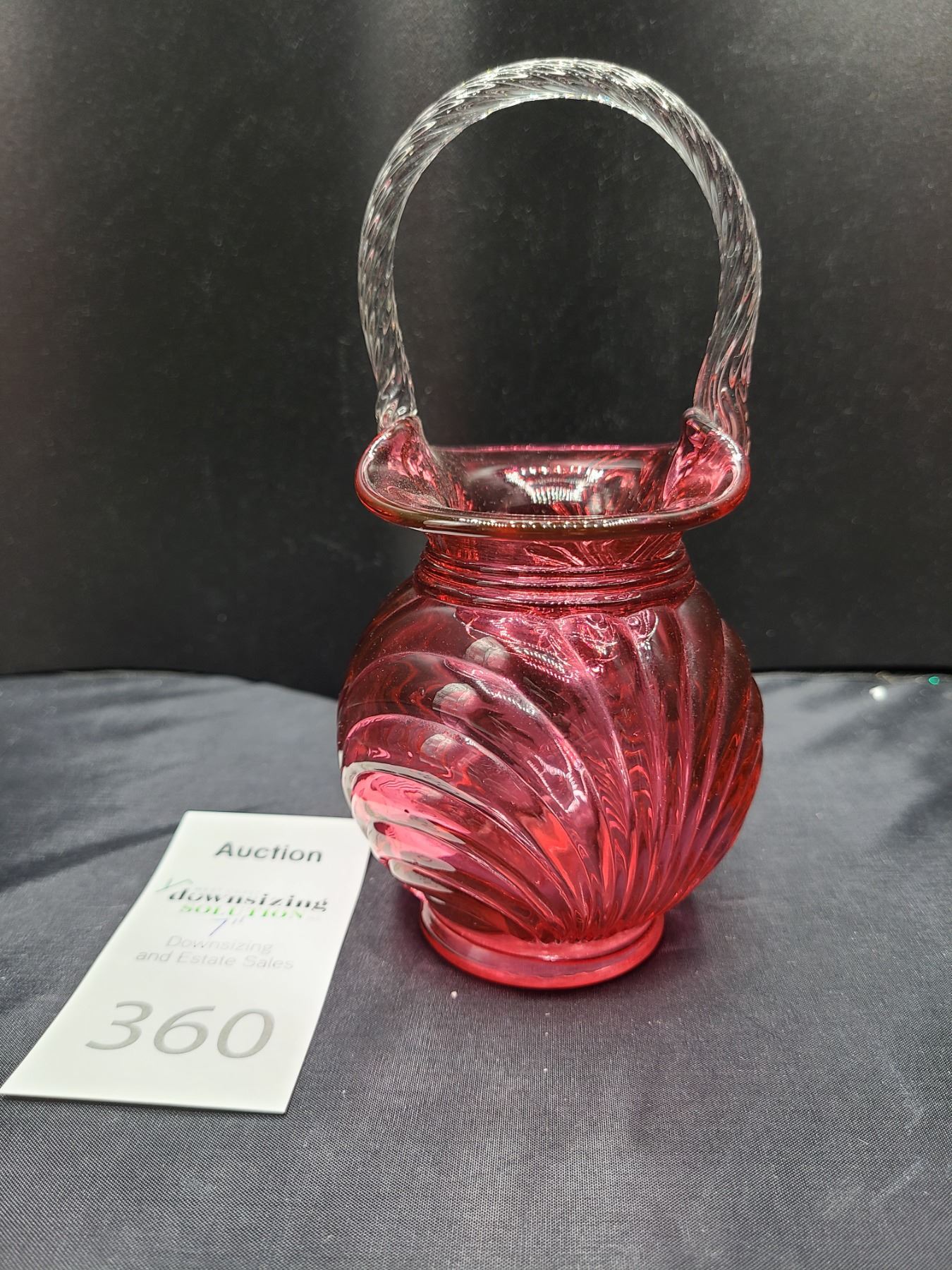 Cranberry glass with clear glass handle 7" Pickup at 10 am