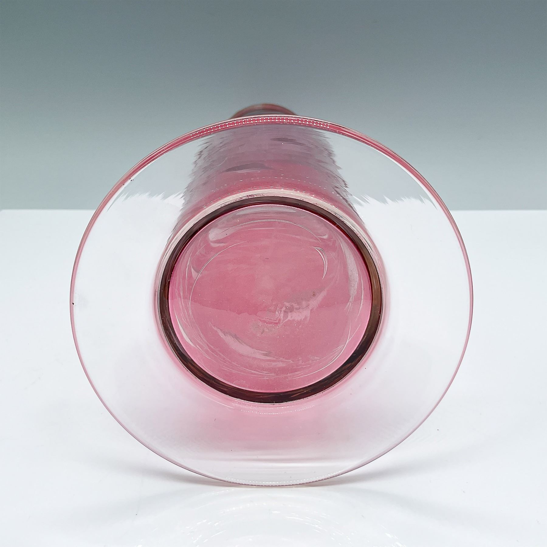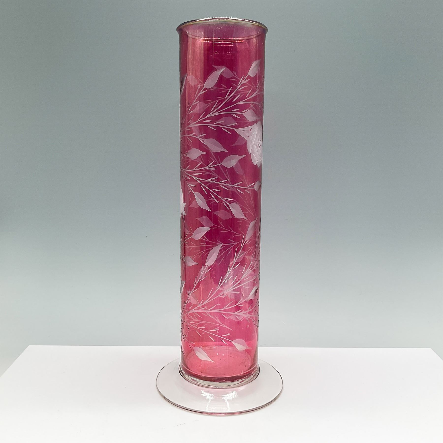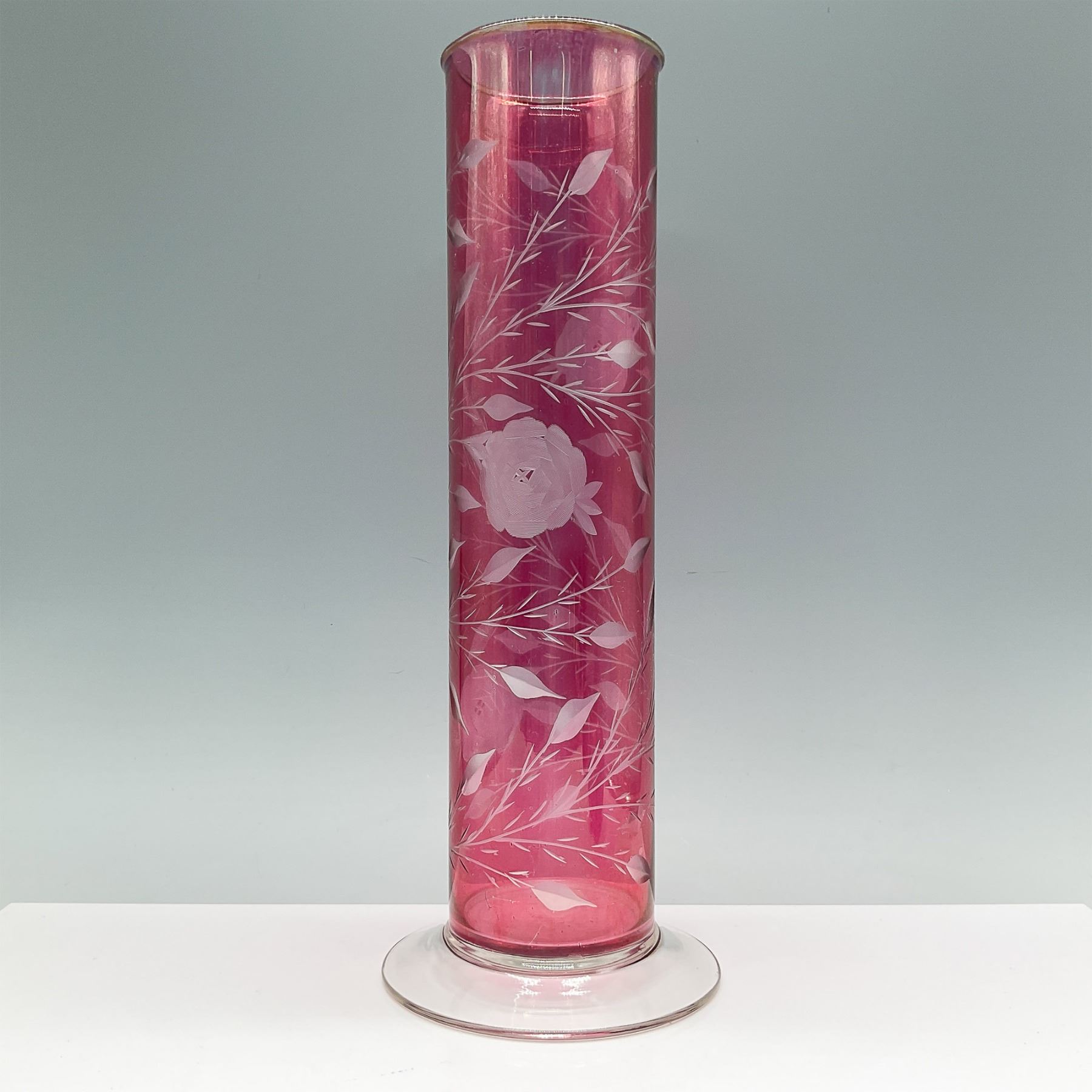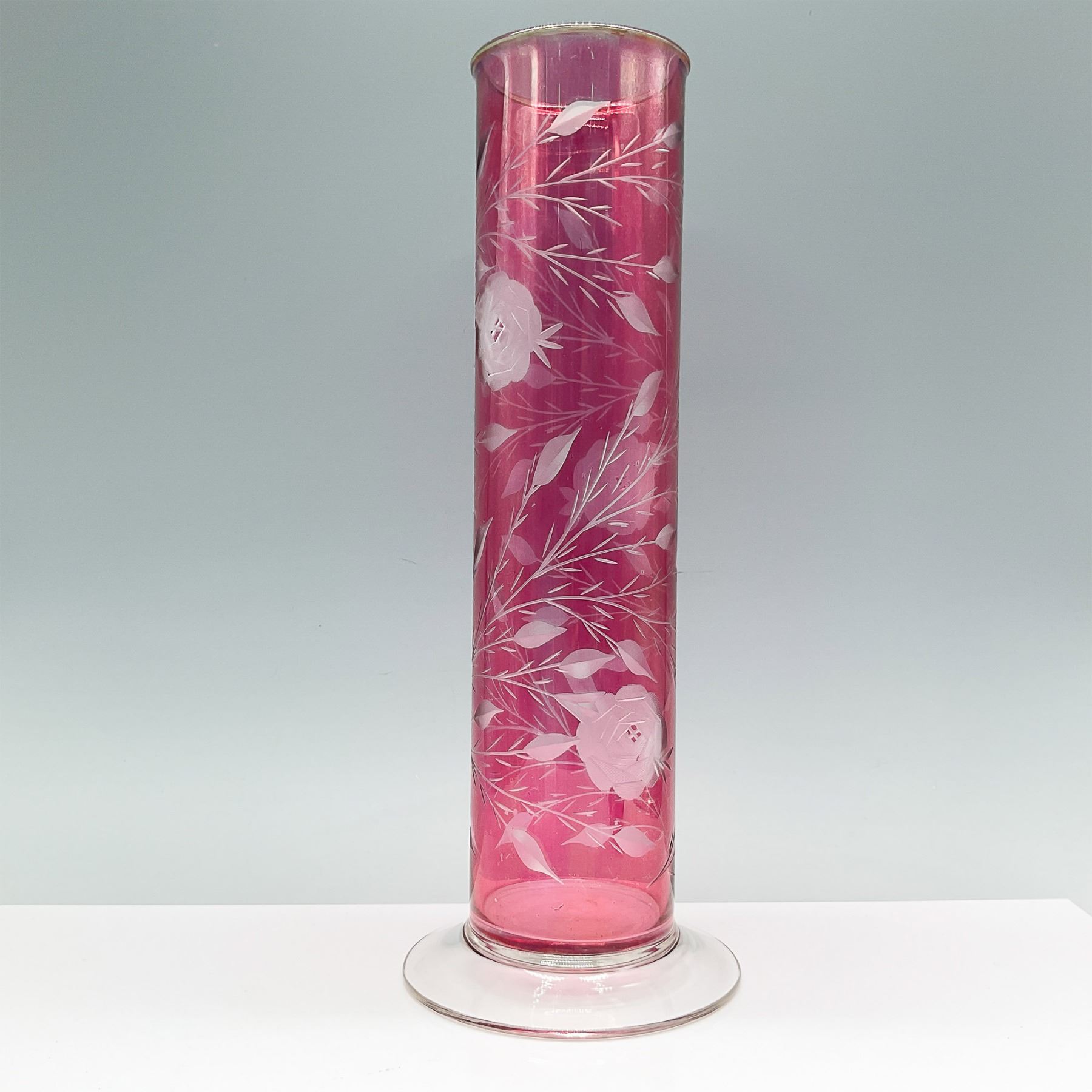 Elegant cranberry glass vase featuring an intricate etched floral design with roses and leaves. This tall vase stands 13"H and is crafted with a clear flared base, offering stability and a striking contrast to the vibrant cranberry hue. A fine addition to any collection or decor, showcasing timeless craftsmanship and artistry.