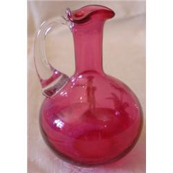 Cranberry Mary Gregory small glass pitcher with applied clear glass handle. Decorated with hand painted scene of boy fishing. Stands 5 1/4" tall.