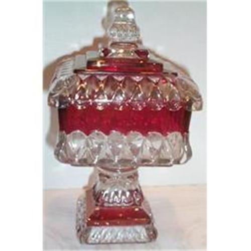 This fantastic Cranberry Stained Footed Compote is molded in the Wedding Pattern and is in SUPERIOR condition with no chips, cracks, or dings and not major scratching to the Cranberry Stained areas. This covered compote measures 4.50" square and stands 8" tall to the top of its lovely finial.