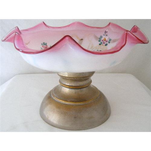 A beautiful hand painted Cranberry Glass and Vaseline Glass bowl mounted on a brass silver plated base. Very Victorian. Underneath the base are these words. R.M.Co. Ltd Montreal, Extra Plate, Brass.