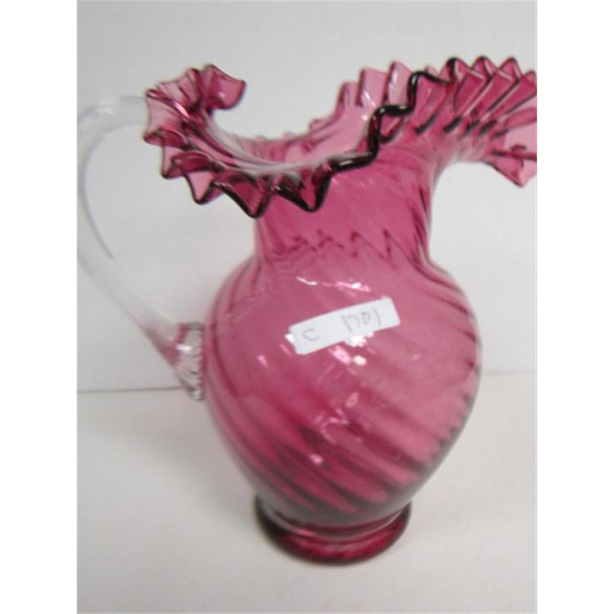 Cranberry glass ruffled top pitcher clear ribbed applied handel-10"