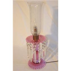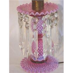 Cranberry hobnailed opalescent electrified lamp w/14 matching prisms & 1 odd prism (15 total) & floral etched shade. 20 1/4" tall to top of shade. 9 1/2" tall base.