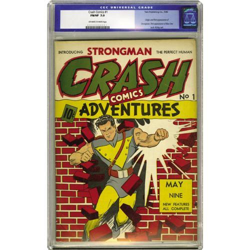 <B>Crash Comics #1 (Tem Publishing Co., 1940) CGC FN/VF 7.0 Off-white to white pages.</B></I> When Jack Kirby contributed art to this issue, he hadn't even made up his Kirby alias yet - the "King," whose real name was Jacob Kurtzberg, signed the name "Jack Curtiss" to his work here. "Curtiss" drew the adventure of the Solar Legion. The book also has the first appearances of Blue Streak and the Strongman. Overstreet 2006 FN 6.0 value = $930; VF 8.0 value = $2,015. CGC census 5/06: 3 in 7.0, 1 higher. <BR><BR><B>Important notice:</B> Heritage usually auctions material at the rate of 200-250 lots per hour. On some occasions eBay Live bid software or the Internet may not be able to keep up with the pace of the auction. We recommend placing a realistic absentee bid now as insurance to avoid disappointment. Occasionally the auctioneer may eliminate or reject an eBay Live bid, and the auctioneer may also reopen a lot after the close of the eBay live bidding (usually because we missed an audience bid), and may reject your bid even if it shows you as the winning bidder. By bidding via eBay Live, you agree that Heritage may award the lot to another bidder at its sole discretion under the circumstances described above or any other reasonable circumstances. Since eBay bids are not shown to us until we open the lot on the floor, we treat those bids just like floor bids. In most cases the floor responds before the eBay bid is presented to us, due to Internet lag time, so for consistency we have made it a policy that floor bids are always considered first over tie eBay live bids. Also please note that all Heritage lots purchased through eBay Live carry a 22.5% Buyer's Premium. Please make sure you read the Terms and Conditions before you bid. This lot is being auctioned in conjunction with a live floor auction by Heritage Auction Galleries. All final auction and invoice information will be supplied by Heritage Auction Galleries, and all other information should be considered preliminary. Lot:41001 <BR><BR><B>Winning Notification and Billing:</B> After the FINAL session in this auction is complete, Heritage will send e-mail and snail mail invoices. This process normally takes several days. All final auction and invoice information will be supplied by Heritage Auction Galleries, and all other information should be considered preliminary. <BR><BR>This auction will be conducted on a live auction floor and over the Internet through eBay Live. If you choose to place an absentee bid, please take a moment to <font color='#0000ff'><u><a href='http://pages.ebay.com/liveauctions/help/before/laabsentee.html'>learn how eBay Live absentee bidding works</a></u></font><font color='#000000'>