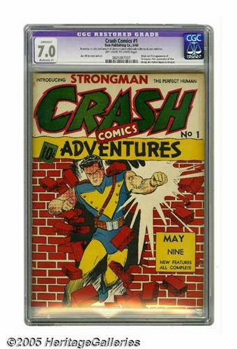 <B>Crash Comics #1 (Tem Publishing Co., 1940) CGC Apparent FN/VF 7.0 Moderate (P) Off-white to white pages.</B></I> This somewhat obscure comic book issue features Jack Kirby art, the origin and first appearance of Strongman, plus the first appearances of Blue Streak, the Perfect Human, and Shangra. CGC notes, "Restoration includes: small amount of color touch, pieces added, spine splits sealed, cover reinforced." Overstreet 2005 GD 2.0 value = $310; VG 4.0 value = $620; FN 6.0 value = $930; VF 8.0 value = $2,015.