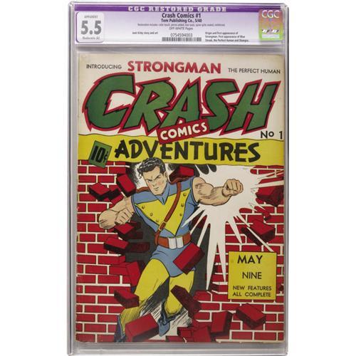 <B>Crash Comics #1 (Tem Publishing Co., 1940) CGC Apparent FN- 5.5 Moderate (A) Off-white pages.</B></I> Early Jack Kirby art. CGC notes, "Restoration includes: color touch, pieces added, tear seals, spine splits sealed, reinforced." Overstreet 2006 GD 2.0 value = $310; VG 4.0 value = $620; FN 6.0 value = $930.<BR><BR><b>Shipping:</b> Slabbed Comic (<a target="_blank" href="http://www.heritageauctions.com/common/shipping.php">view shipping information</a>)