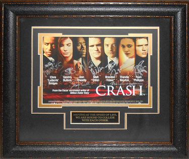 Crash is a 2005 ensemble drama film co-written, produced, and directed by Paul Haggis. The film is about racial and social tensions in Los Angeles, California. A self-described "passion piece" for Haggis, Crash was inspired by a real-life incident, in which his Porsche was carjacked outside a video store on Wilshire Boulevard in 1991The film stars Sandra Bullock, Don Cheadle, Matt Dillon, Jennifer Esposito, Michael Peña, Brendan Fraser, Terrence Howard, Chris "Ludacris" Bridges, Thandie Newton, and Ryan Phillippe. The film received six Academy Award nominations, including Best Picture and Best Director for Paul Haggis, and won three for Best Picture, Best Original Screenplay, and Best Film Editing at the 78th Academy Awards. It was also nominated for nine BAFTA awards, and won two, for Best Original Screenplay and Best Supporting Actress for Thandie Newton.This is an signed Publicity Masterprint 11x17 inch movie poster with museum Quality Custom Leather Framing as shown to an overall size of 22x30. Chris "Ludacris" Bridges, Matt Dillon, Brendan Fraser, Sandra Bullock, Don Cheadle, Ryan Phillippe & Thandie Newton have signed this poster. The perfect addition to complement any Home Theater Collection. Witnessed, Examined, and Certified Authentic (Lifetime) by Millionaire Gallery, Inc.