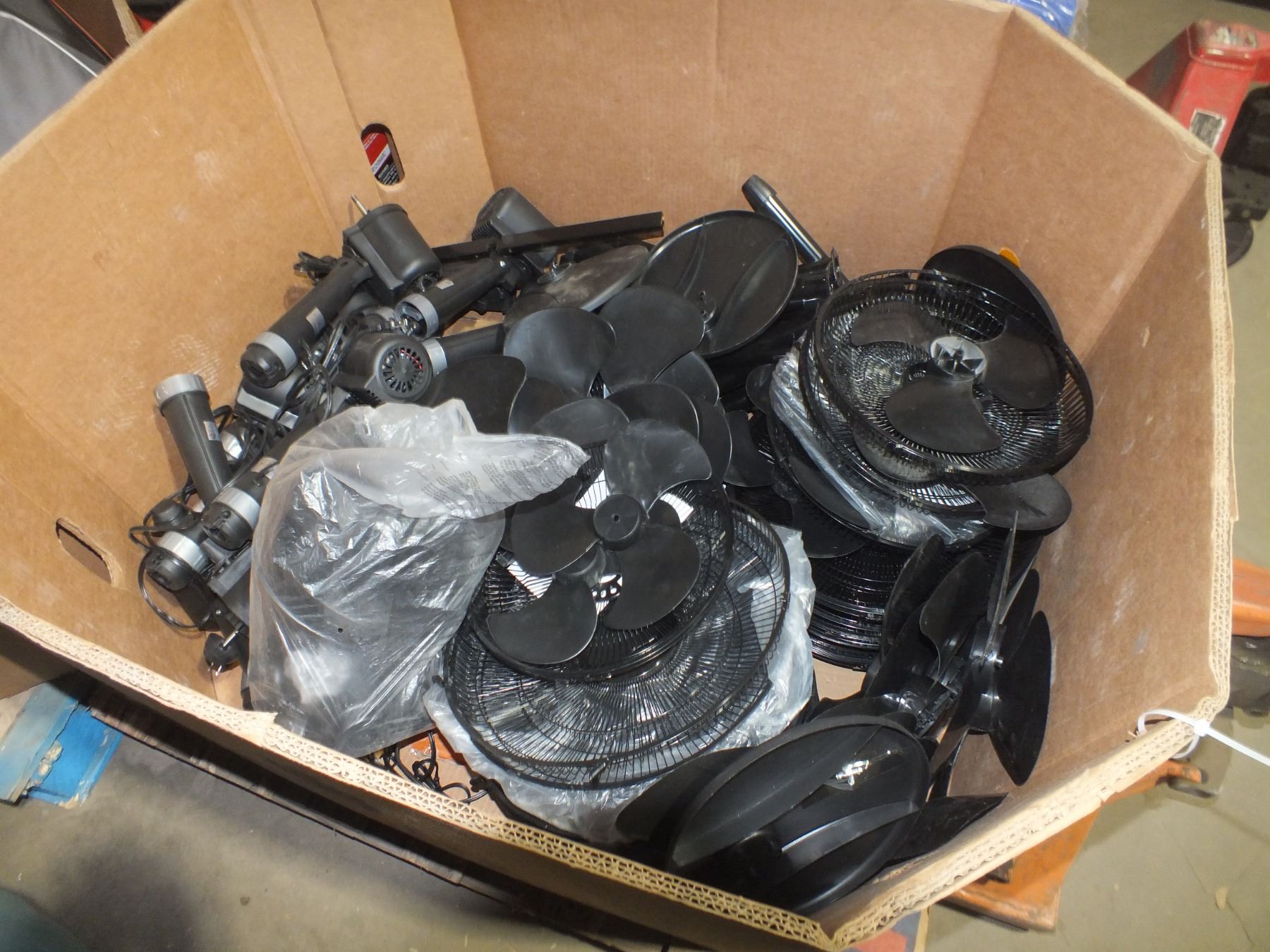 Crate Of Fans And Parts, approx 12 fans and parts, may be missing pcs...