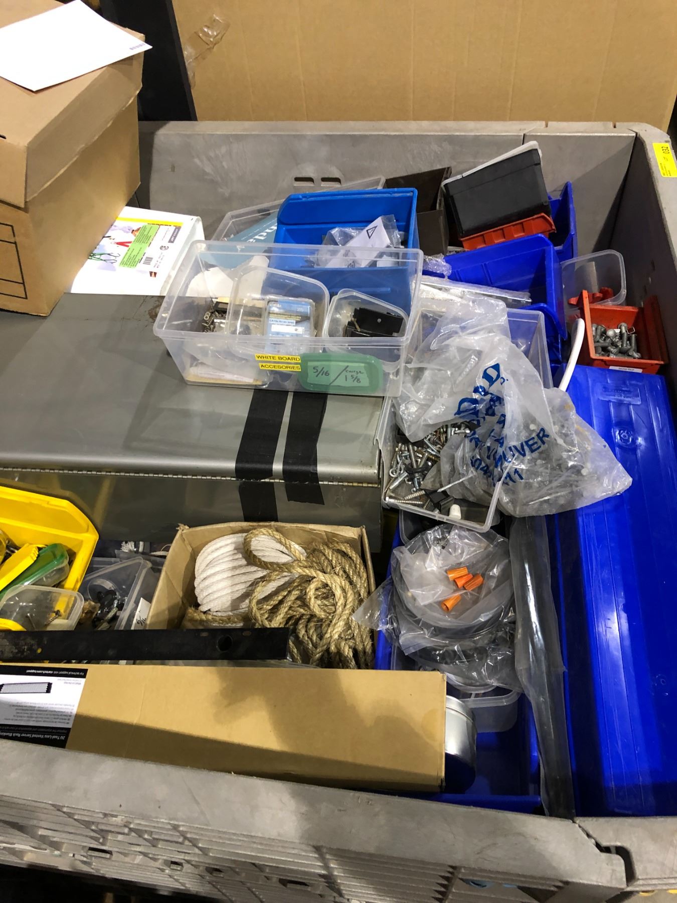 Crate of misc screws and bolts with storage bins and metal tool box all from Set Decor Rentals