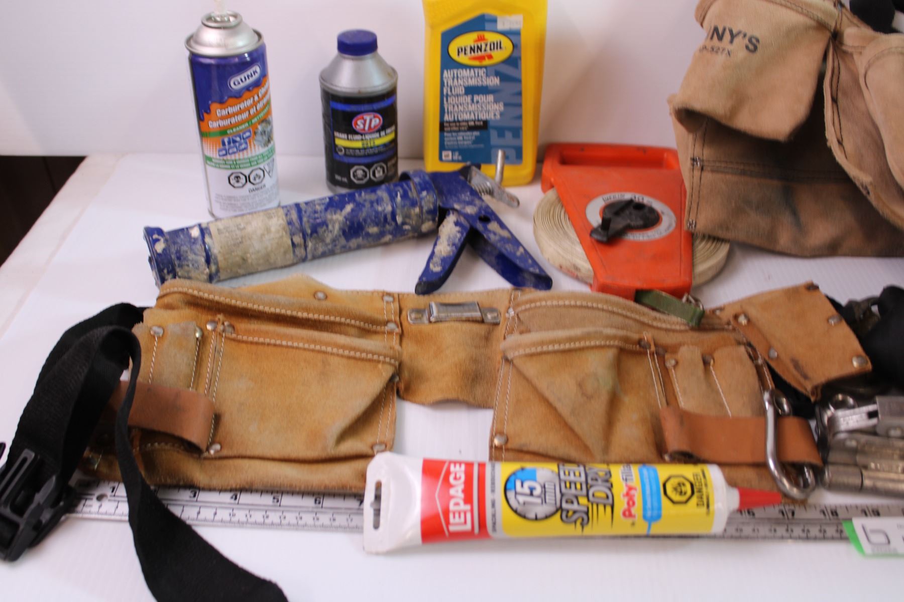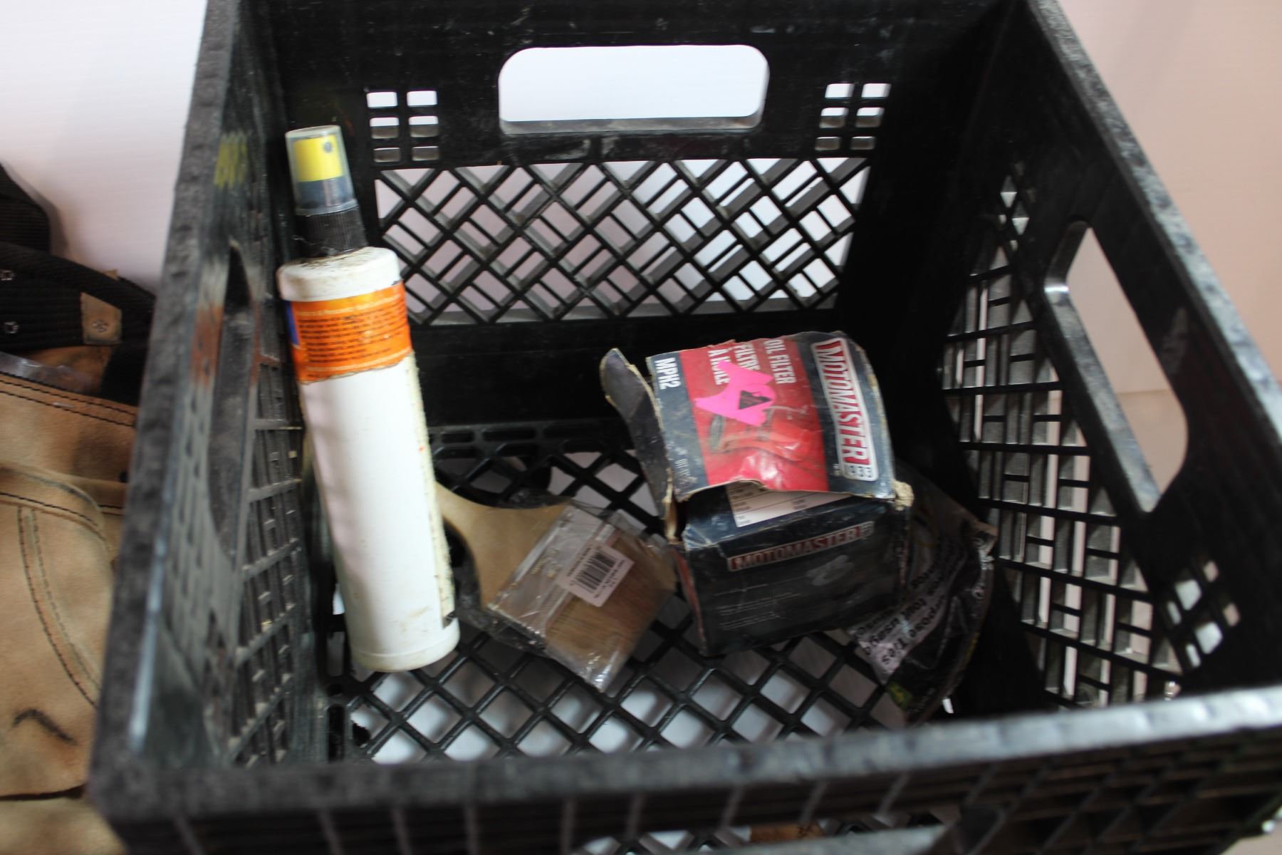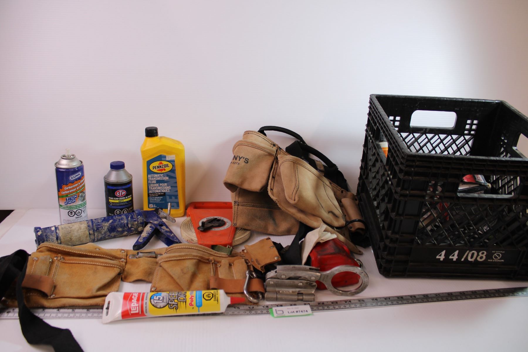 Crate w/ (2) Tool Belts, Caulking Gun + Misc