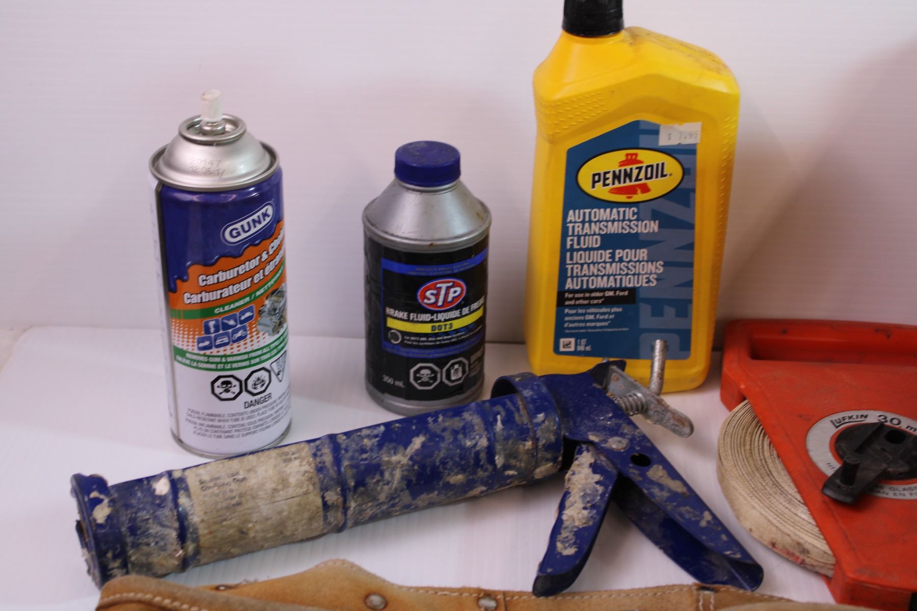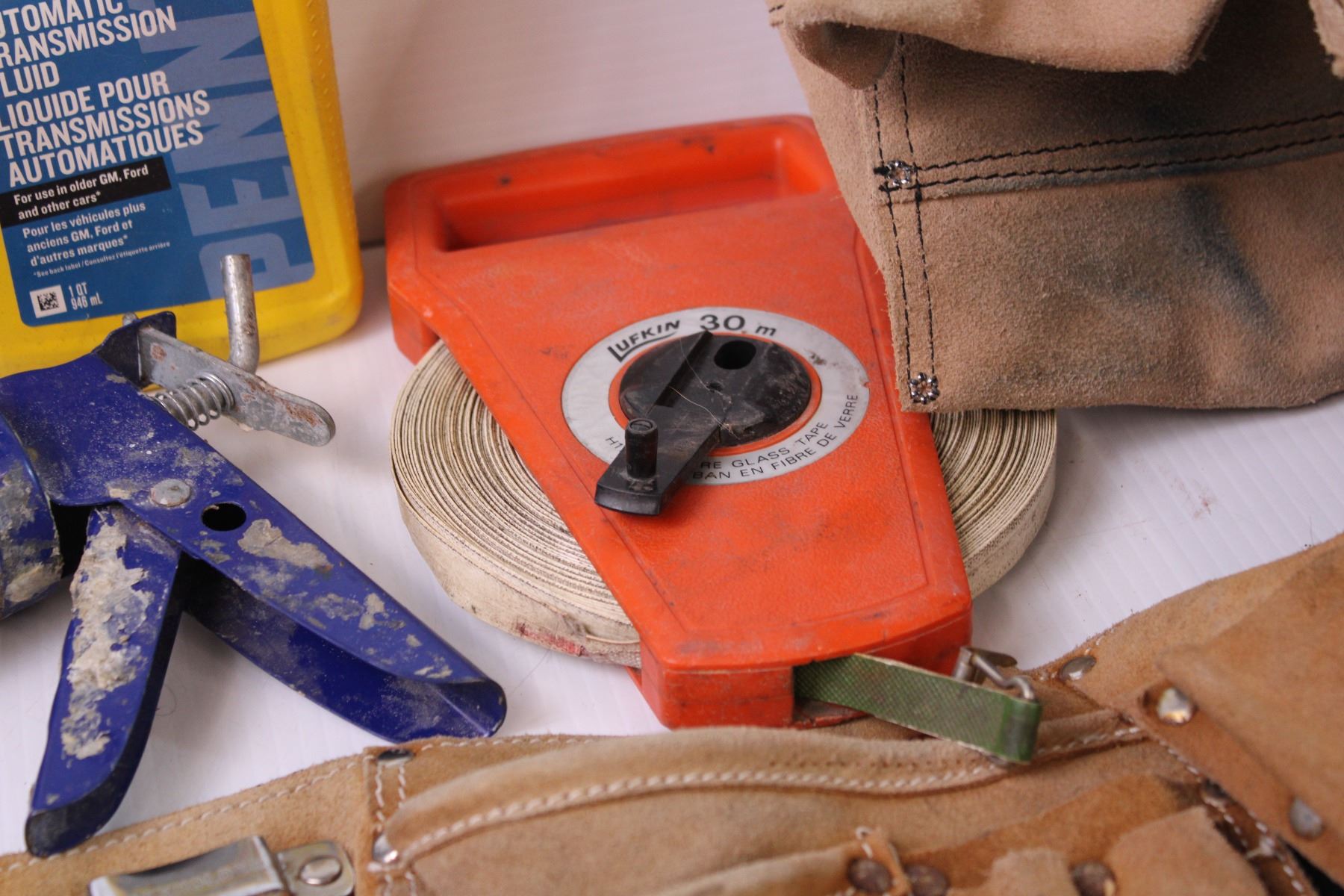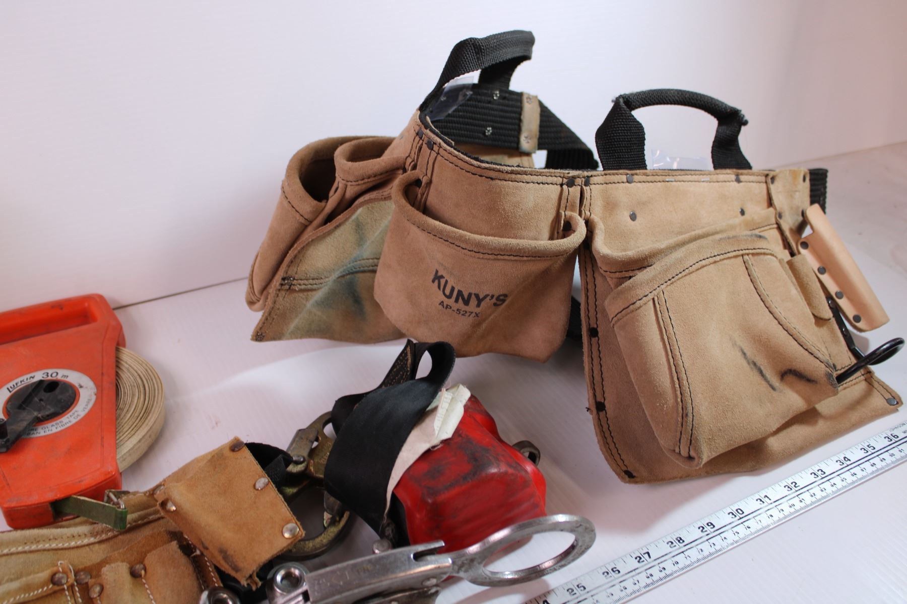 Crate w/ (2) Tool Belts, Caulking Gun + Misc