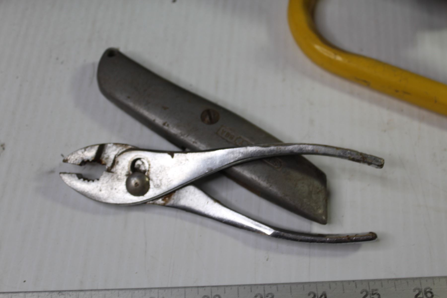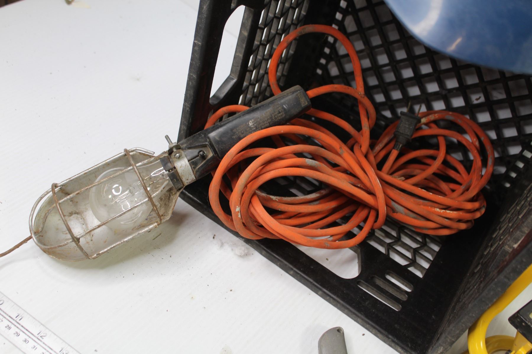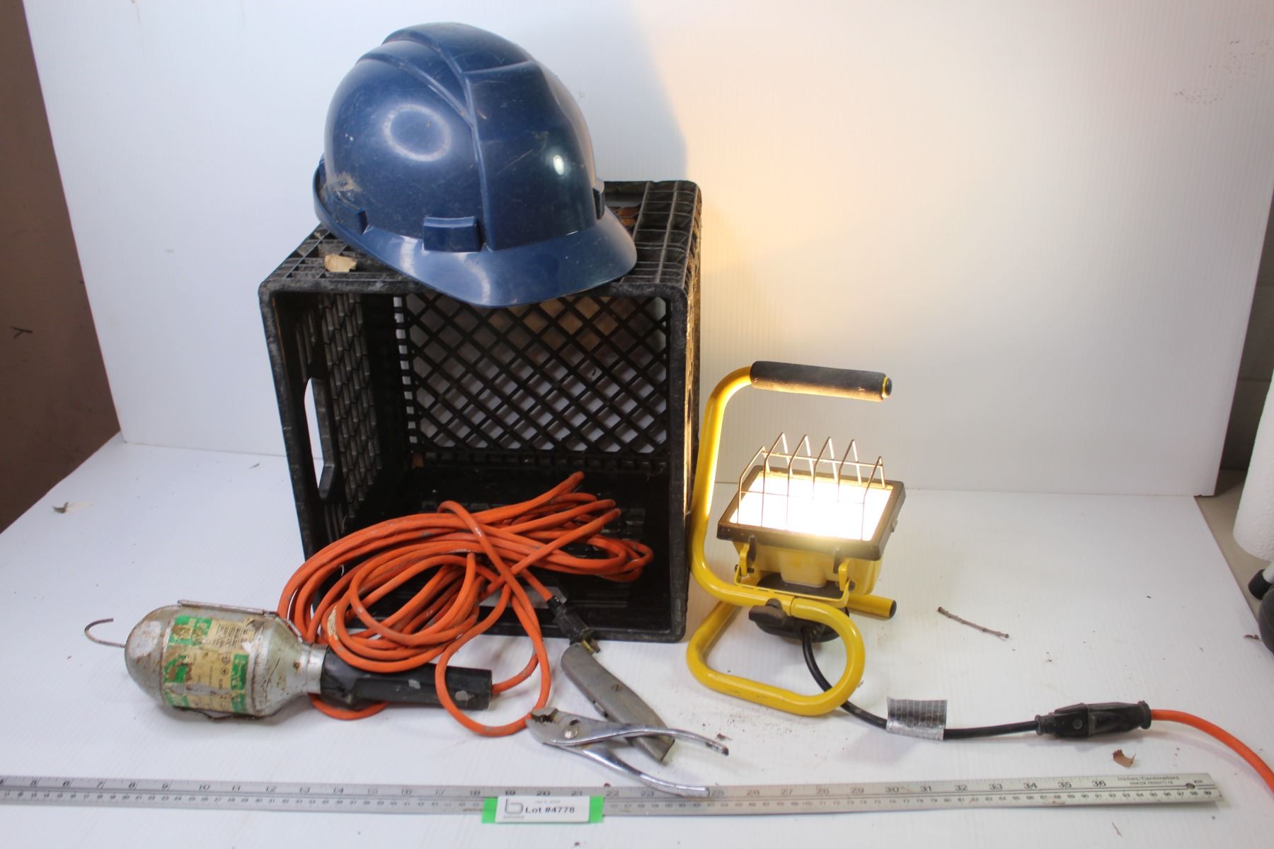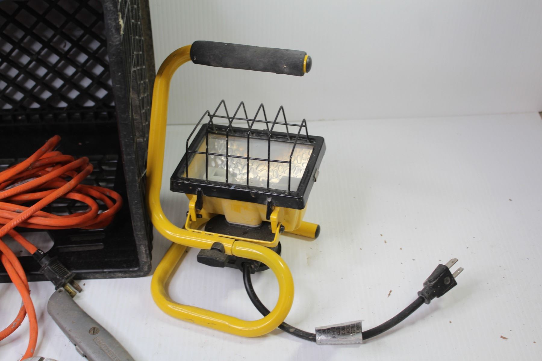 Crate w/Trouble Light - Hard Hat - Pliers & Drywall Knife - Work Light (working)