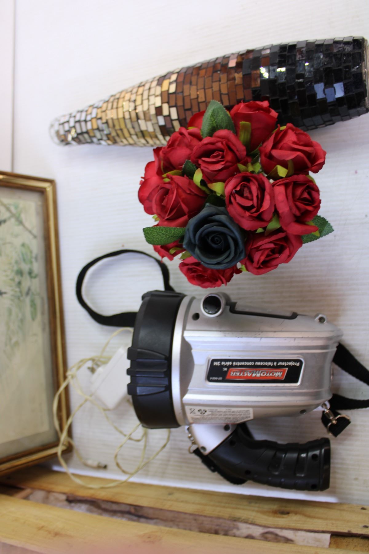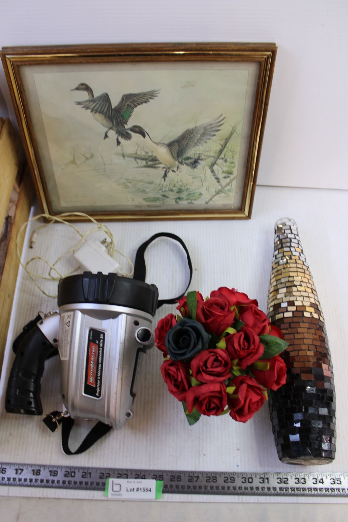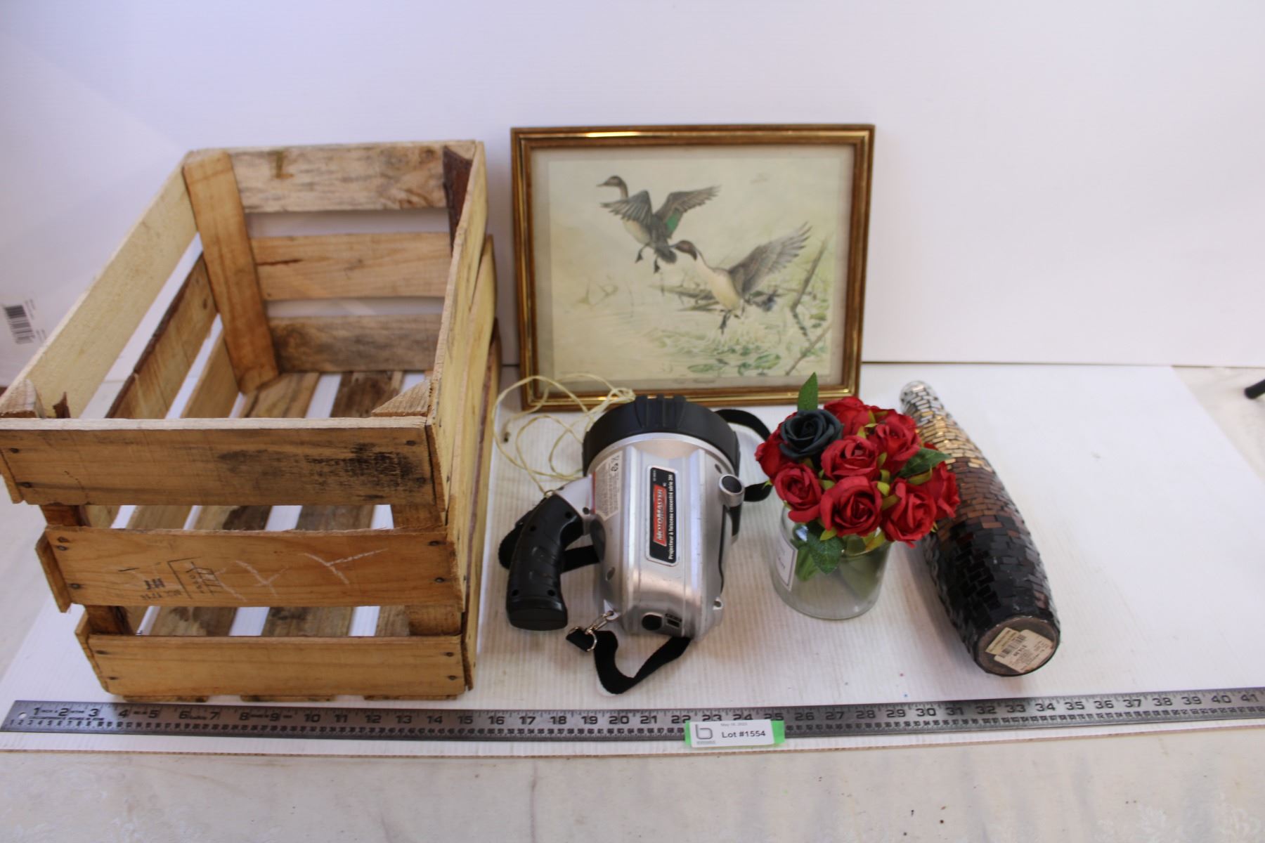 Crate with Rechargeable Light + Vase + Jar with Flowers + Pictures of Birds
