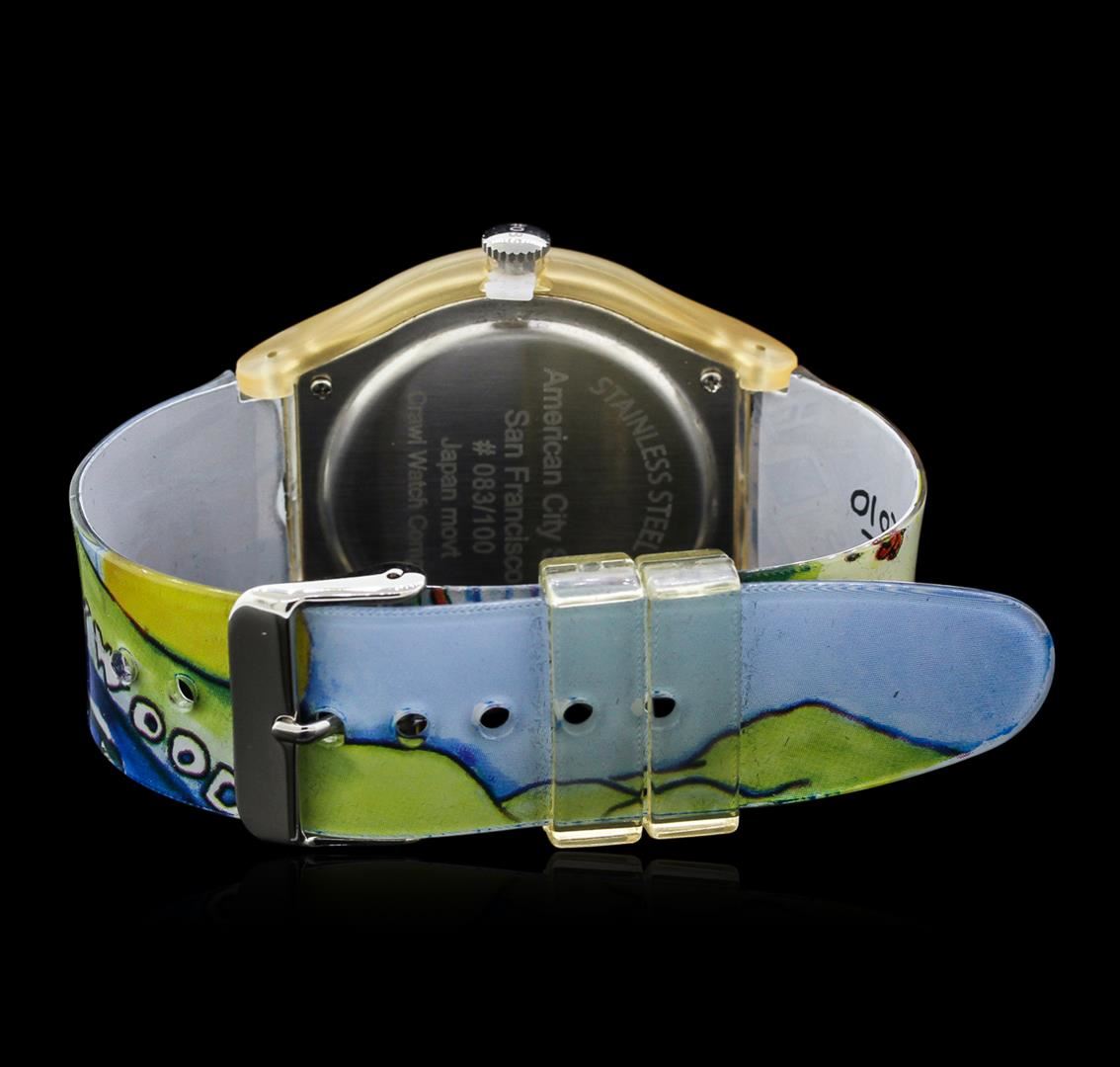 Limited edition designer watch by the Crawl Watch Company. This watch features the artwork of Linnea Pergola and is titled "San Francisco" from the American City Series. The piece is numbered and signed by the artist on the inside of the band. Piece is number 83 of only 100. Each watch represents the unique symbols of each city which make up the great nation of America. Linnea Pergola creates vivid scenes of familiar locations found around the world and transforms them into modern day masterpieces. "San Francisco" is a limited edition analog watch produced by Crawl Watch Co. with a stainless steel back with the edition numbering engraved onit from Pergola's "American City" series. Inspired by the world-famous city of San Francisco, this piece depicts some of the great symbols of the city. The watch comes in a beautiful decorative box adorned with the artist's artwork of San Francisco, Chicago, New York, New Orleans, and Los Angeles. Measures approx. 1.5" (watch face diameter), 4" x 4" x 2" (box). This timepiece is one of only 100 limited edition watches that feature the unmistakable art of Linnea Pergola. This unique artwork has been exhibited throughout Europe and the United States. Pergola's paintings and original prints are immediately recognizable by her signature style. Well known urban landmarks around the world are turned into animated scenes with electric color. The art of Linnea Pergola has been featured in such galleries as the Ambassador Gallery in New York, the Fine Art Museum of Long Island, Martin Lawrence Gallery in Chicago, Roberts Gallery in Scottsdale, Art One Gallery in LA, John Szoke Graphics in New York and Gallerie I.D. in Geneva Switzerland.