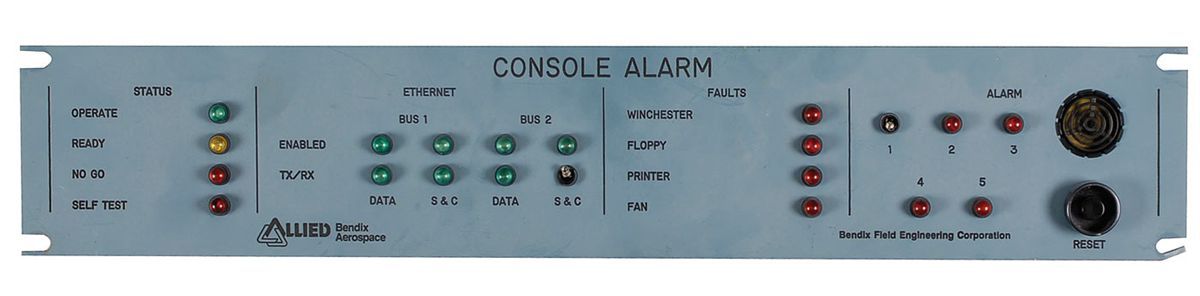 Large console alarm panel from Crawler #2, 19 x 3.75, manufactured by Allied Bendix Aerospace. Alarm has four status lights, four fault alarm lights, and five more alarm lights, as well as a small speaker and reset button. In fine condition, with two broken alarm lights and expected light wear. The crawlers were used to transport Space Shuttles from 1981 to 2011. The crawler-transporters carry vehicles on the Mobile Launcher Platform, and after each launch return to the pad to take the platform back to the Vehicle Assembly Building.
