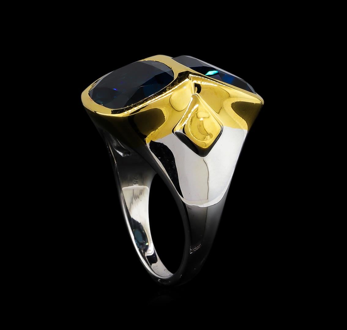 From the brand whose products have inspired creative expression for more than 110 years comes this beautiful ring by Crayola. This stunning piece of jewelry reflects the image and colorful personality of the Crayola brand. The Ring features .925 Silver With Rhodium Two-Tone weighing 6.5oz containing Midnight Blue London Blue Topaz (AAA) Cushion 12x10mm (With J BACK & Yellow Pan Rhodium) Laser engraved "C" logo on side. Total Blue Topaz weight is 10.9ct.