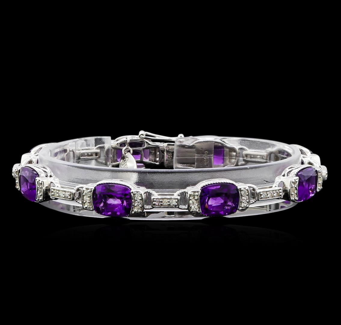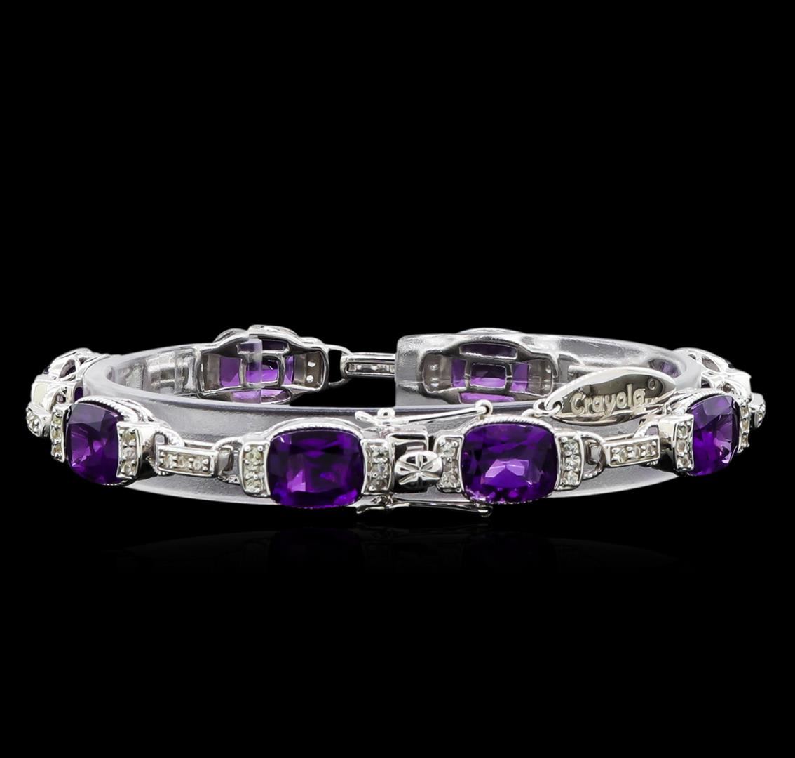 From the brand whose products have inspired creative expression for more than 110 years comes this beautiful bracelet by Crayola. This stunning piece of jewelry reflects the image and colorful personality of the Crayola brand. The Bracelet features .925 Silver With Rhodium weighing 17.73oz containing Purple Heart Amethyst (AAA) Cushion 10x8mm - 8Pcs + Natural White Sapphire Round 1.50mm - 69Pcs (With J BACK). Total Amethyst weight is 20ct. Total White Sapphire weight is 1.17ct. Measures: 7.50".