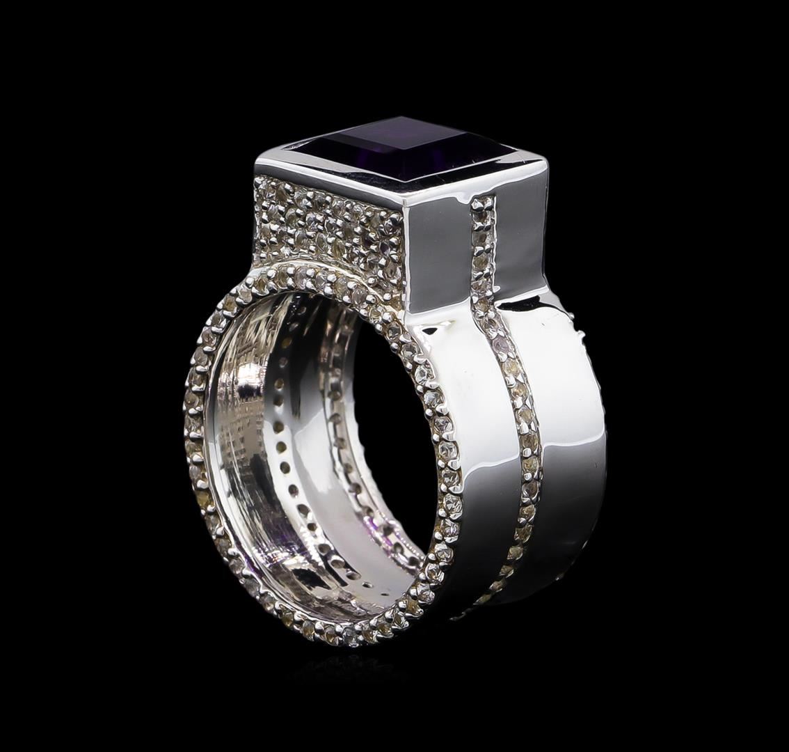 From the brand whose products have inspired creative expression for more than 110 years comes this beautiful ring by Crayola. This stunning piece of jewelry reflects the image and colorful personality of the Crayola brand. The Ring features .925 Silver With Rhodium weighing 8.2oz containing Purple Heart Amethyst (AAA) Square 9.00mm - 1Pc + Natural White Sapphire Round 1.10mm - 195Pcs (With J BACK). Total Amethyst weight is 3.5ct. Total White Sapphire weight is 1.76ct.