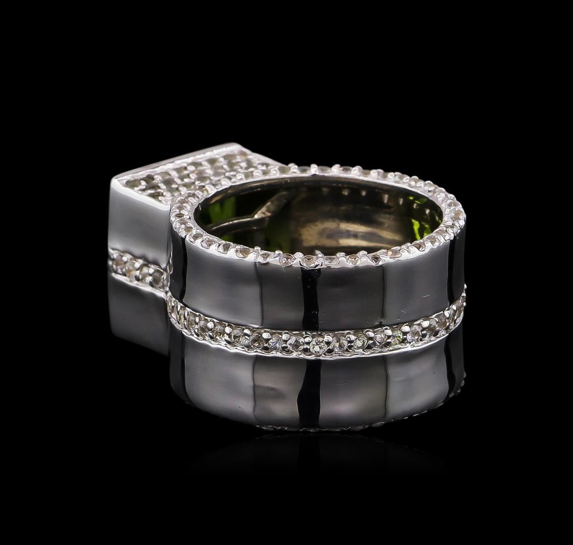 From the brand whose products have inspired creative expression for more than 110 years comes this beautiful ring by Crayola. This stunning piece of jewelry reflects the image and colorful personality of the Crayola brand. The Ring features .925 Silver With Rhodium weighing 8.2oz containing Granny Smith Apple Peridot (AAA) Square 9.00mm - 1Pc + Natural White Sapphire Round 1.10mm - 195Pcs (With J BACK). Total Peridot weight is 3.5ct. Total White Sapphire weight is 1.76ct.