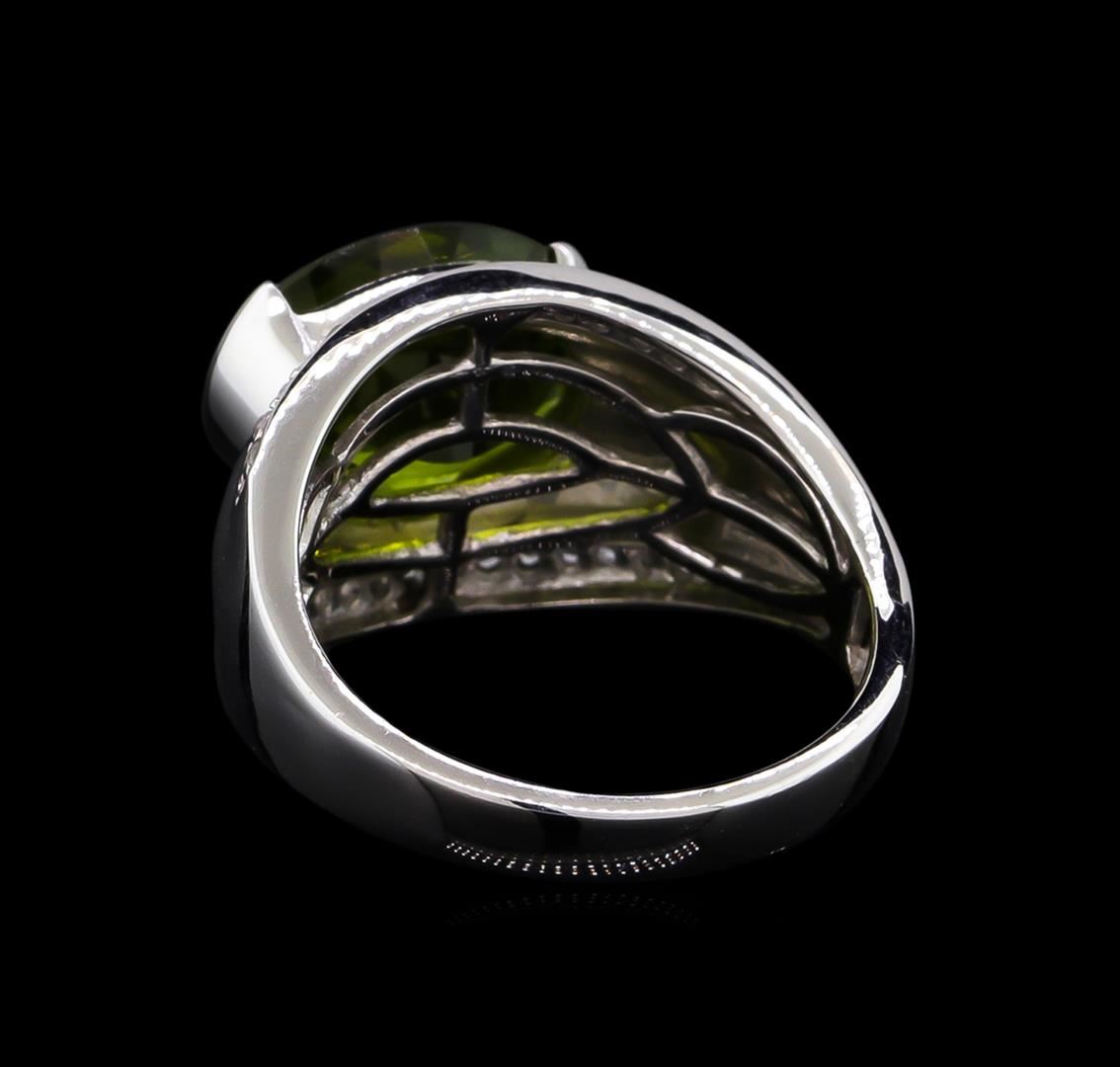 From the brand whose products have inspired creative expression for more than 110 years comes this beautiful ring by Crayola. This stunning piece of jewelry reflects the image and colorful personality of the Crayola brand. The Ring features .925 Silver With Rhodium weighing 5.58oz containing Granny Smith Apple Peridot (AAA) CB Oval 12x10mm - 1Pc + Natural White Sapphire Round 1.20mm - 32Pcs (With J BACK). Total Peridot weight is 3.95ct. Total White Sapphire weight is 0.38ct.