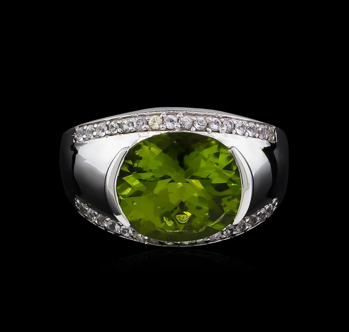 From the brand whose products have inspired creative expression for more than 110 years comes this beautiful ring by Crayola. This stunning piece of jewelry reflects the image and colorful personality of the Crayola brand. The Ring features .925 Silver With Rhodium weighing 5.58oz containing Granny Smith Apple Peridot (AAA) CB Oval 12x10mm - 1Pc + Natural White Sapphire Round 1.20mm - 32Pcs (With J BACK). Total Peridot weight is 3.95ct. Total White Sapphire weight is 0.38ct.