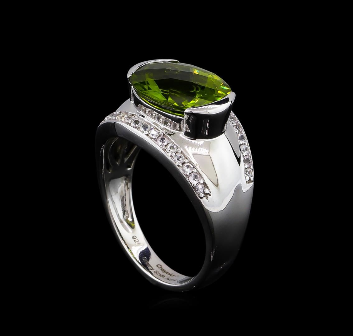 From the brand whose products have inspired creative expression for more than 110 years comes this beautiful ring by Crayola. This stunning piece of jewelry reflects the image and colorful personality of the Crayola brand. The Ring features .925 Silver With Rhodium weighing 5.58oz containing Granny Smith Apple Peridot (AAA) CB Oval 12x10mm - 1Pc + Natural White Sapphire Round 1.20mm - 32Pcs (With J BACK). Total Peridot weight is 3.95ct. Total White Sapphire weight is 0.38ct.