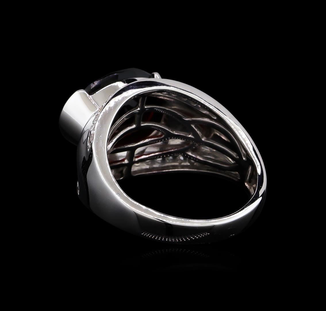 From the brand whose products have inspired creative expression for more than 110 years comes this beautiful ring by Crayola. This stunning piece of jewelry reflects the image and colorful personality of the Crayola brand. The Ring features .925 Silver With Rhodium weighing 5.58oz containing Maroon Garnet (AAA) CB Oval 12x10mm - 1Pc + Natural White Sapphire Round 1.20mm - 32Pcs (With J BACK). Total Garnet weight is 5.1ct. Total White Sapphire weight is 0.38ct.