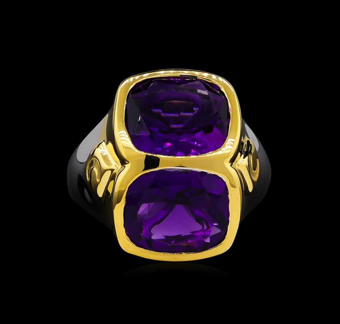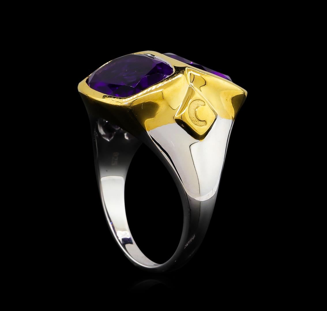 From the brand whose products have inspired creative expression for more than 110 years comes this beautiful ring by Crayola. This stunning piece of jewelry reflects the image and colorful personality of the Crayola brand. The Ring features .925 Silver With Rhodium Two-Tone weighing 6.5oz containing Purple Heart Amethyst (AAA) Cushion 12x10mm (With J BACK & Yellow Pan Rhodium) Laser engraved "C" logo on side. Total Amethyst weight is 8.9ct.