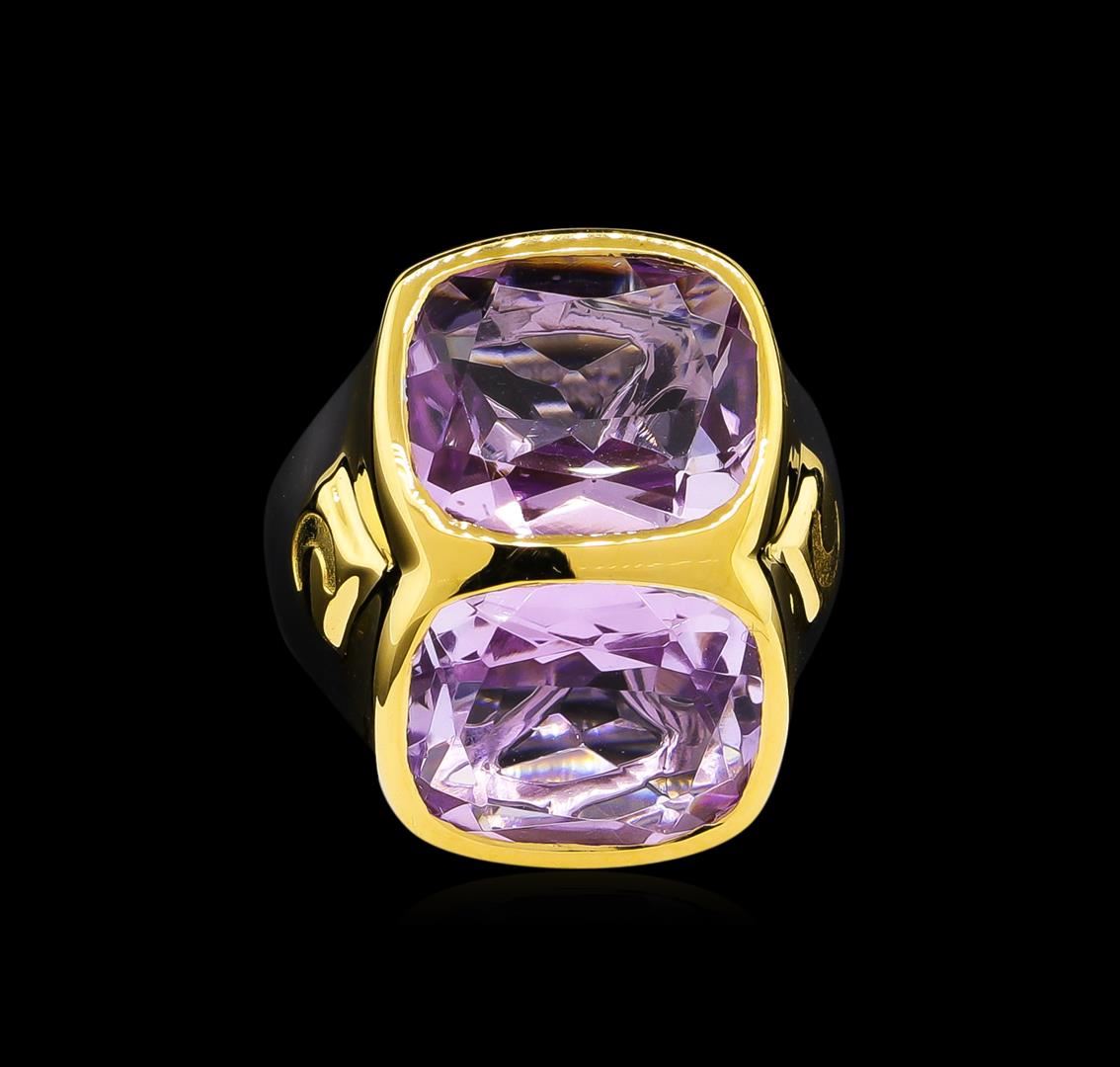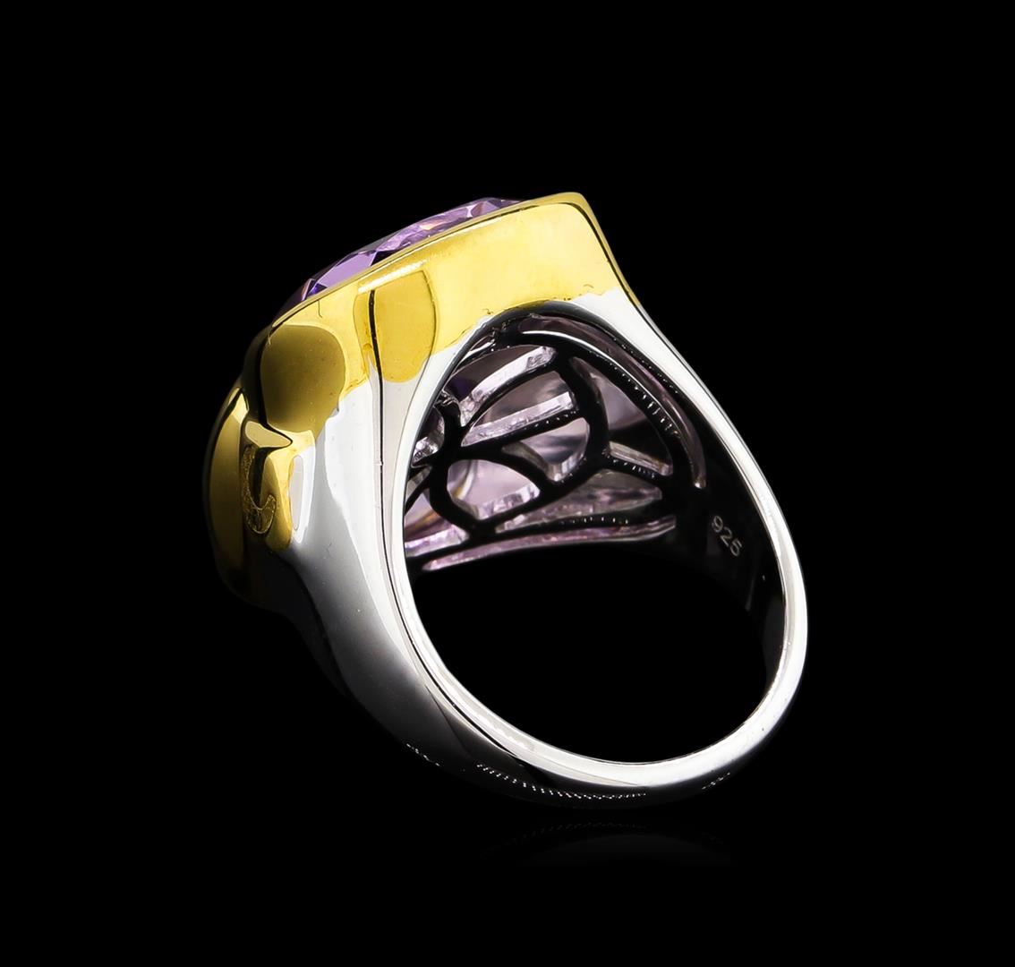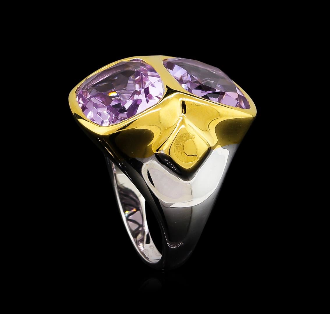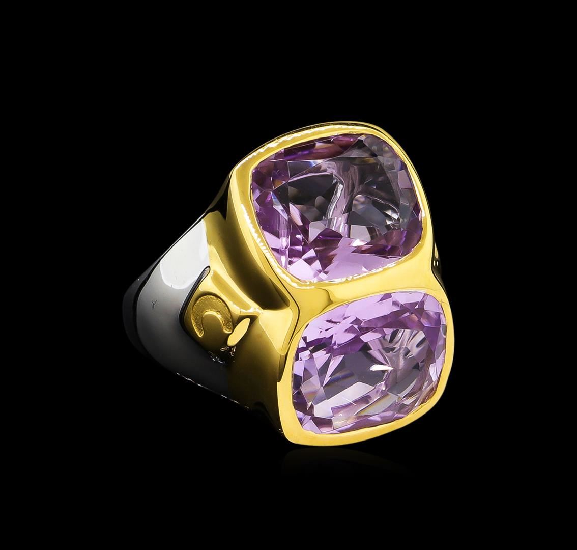 From the brand whose products have inspired creative expression for more than 110 years comes this beautiful ring by Crayola. This stunning piece of jewelry reflects the image and colorful personality of the Crayola brand. The Ring features .925 Silver With Rhodium Two-Tone weighing 6.5oz containing Blush Dark Pink Amethyst (AAA) Cushion 12x10mm (With J BACK & Yellow Pan Rhodium) Laser engraved "C" logo on side. Total Pink Amethyst weight is 8.9ct.