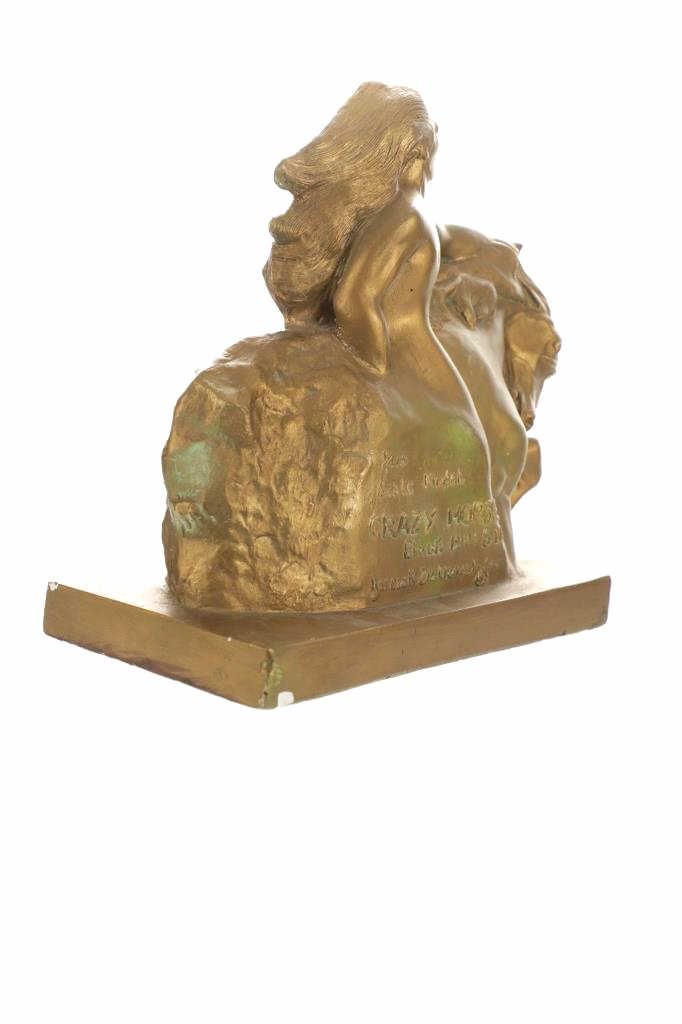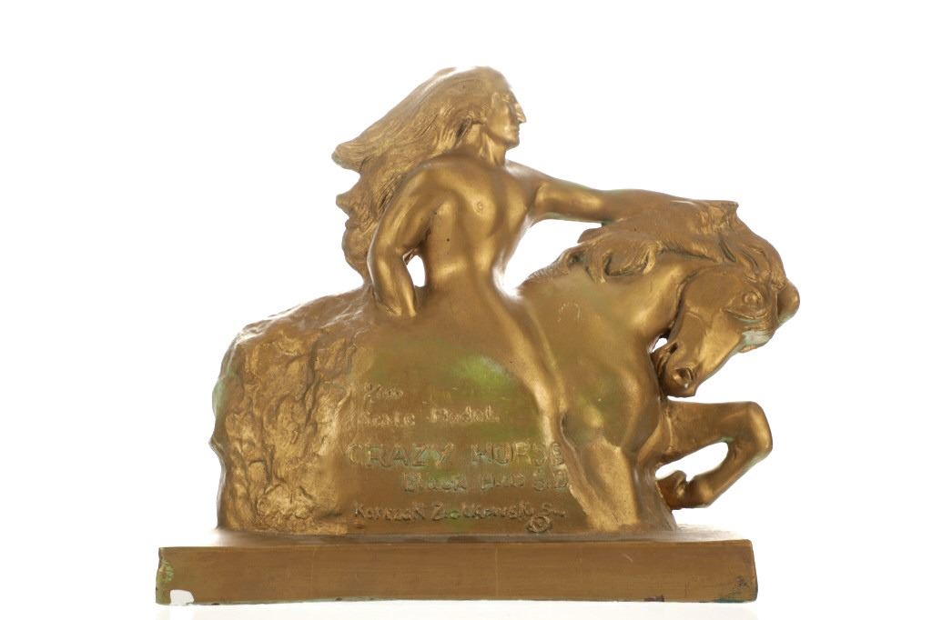 Featured in this lot is this scale model chalkware called "Crazy Horse," by Korezak Ziolkawski. The sculpture is wonderfully and beautifully crafted from a chalkware construction that shows the Native man "Crazy Horse" riding his horse with his hand on the horses mane. The sculpture is marked on the side and reads as follows: 1/600 - Scale Model - Crazy Horse - Black Hills S.D. - Korezak Ziolkawski So. - and shows a copyright marking. The condition of this chalk ware sculpture is good with no no signs of damage and shows good overall condition. The measurements of this sculpture is 11 3/4" x 12 1/2".