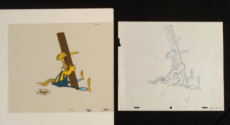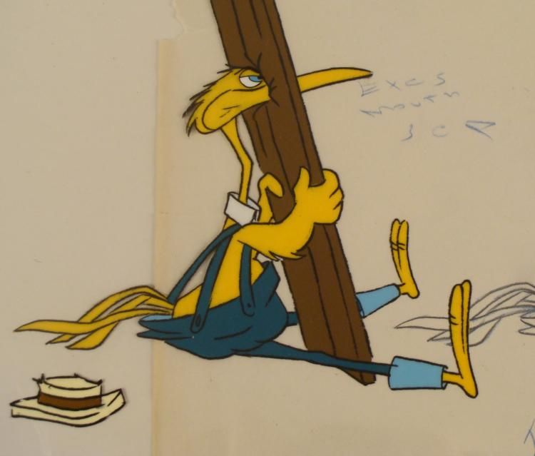 Here is an original animation cel and drawing used in the production of The New Pink Panther show cartoon, done at the studio of DePatie & Freleng. Crazyleg Crane was a 16-episode made-for-television cartoon series. The program ran on television throughout the 1970's. In this scene he's got his beak stuck in a board. The cel comes with a matching overlay drawing of Crazy Leg Crane, stuck in a piece of wood. * Original Animated Cel and Drawing * Original "rough" animation drawing, in non-photo blue and black with the notations in non-photo blue and black * Overall size is a 12-field drawing that is 10 1/2" × 12 1/2" Excellent condition This is an original hand-painted cel set-up used in the production of an episode of "The New Pink Panther Show." Each one-of-a-kind set-up represents a slight change in position of the characters. When individually photographed and projected in rapid succession, the images appear to move. * To create production cels, the original animator's drawing is transferred onto an acetate cel (by hand-inking and/or photo copying). The cel is then hand-painted on the reverse side. * The cel and drawing are ready to framed and matted. The animator's notations are shown at the bottom of the cel and throughout the drawing. The cel is multi-layered and are stapled together. There is a slight tear to upper left side of the drawing. * * *