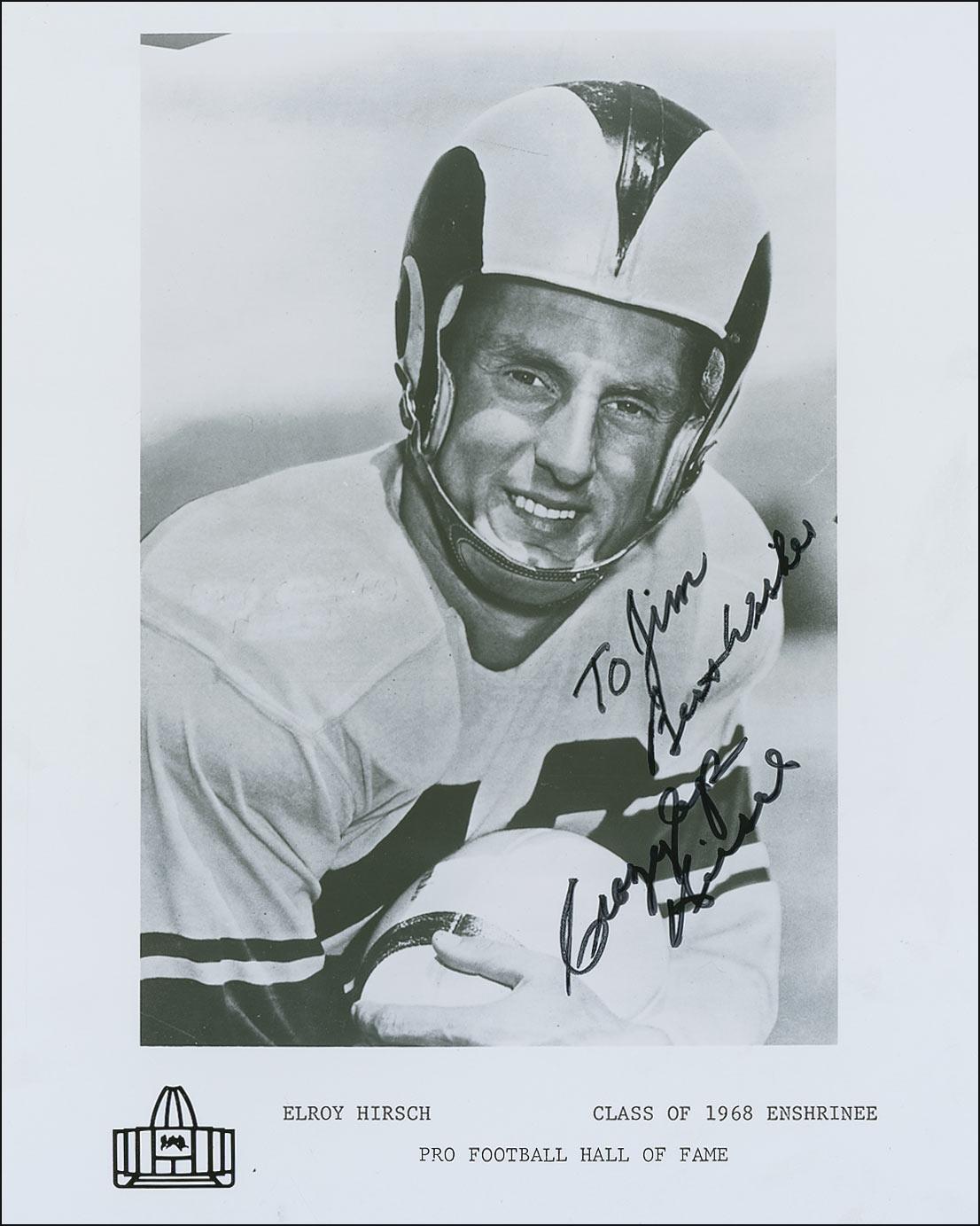 Glossy 8 x 10 Football Hall of Fame enshrinement photo, signed and inscribed in black felt tip “To Jim, best wishes, Crazylegs Hirsch.” In fine condition.