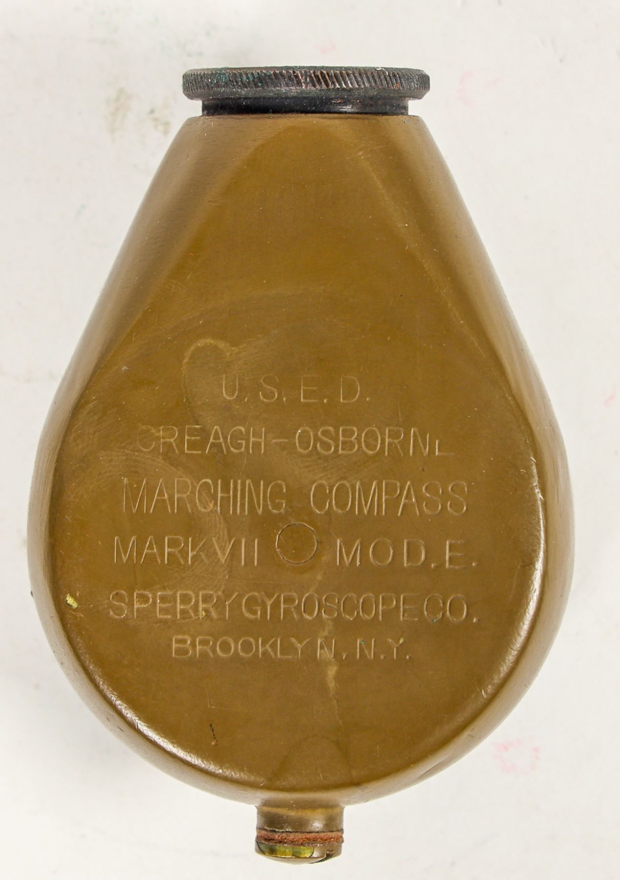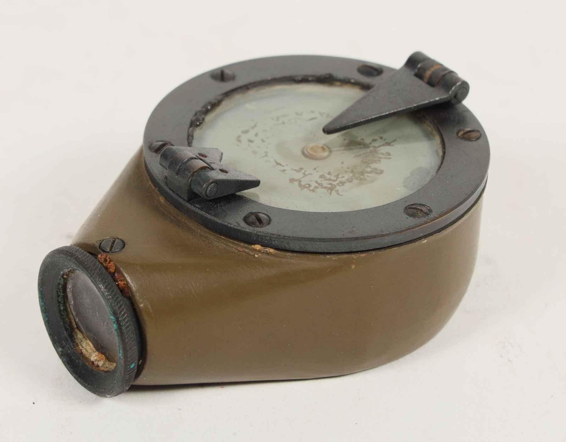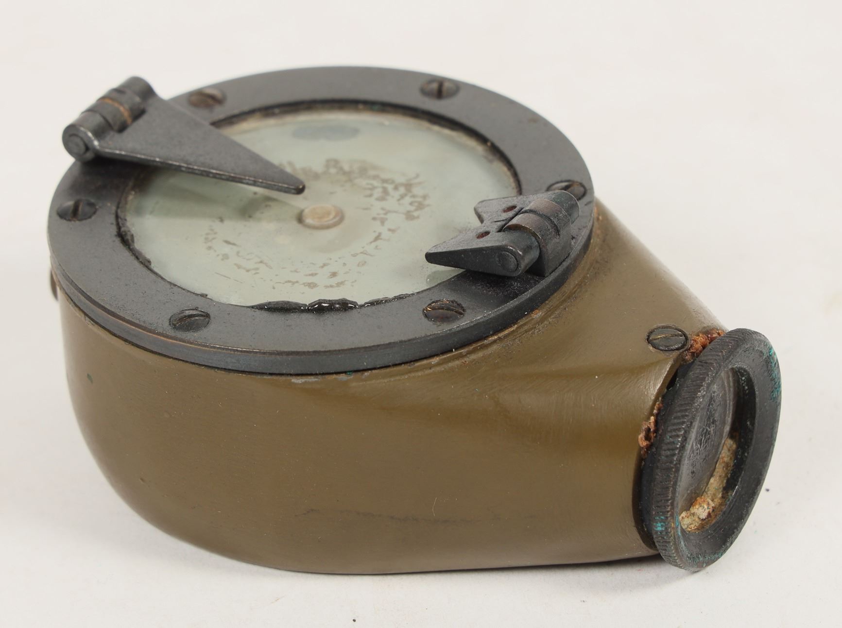 This is a Creagh-Osborne marching compass model mark V11 from WW1. The case is in excellent condition however the compass lens is cloudy and the card is not visible. The side sighing glass is also cloudy. In fair condition. From the Popovich collection. Please see photo for details.