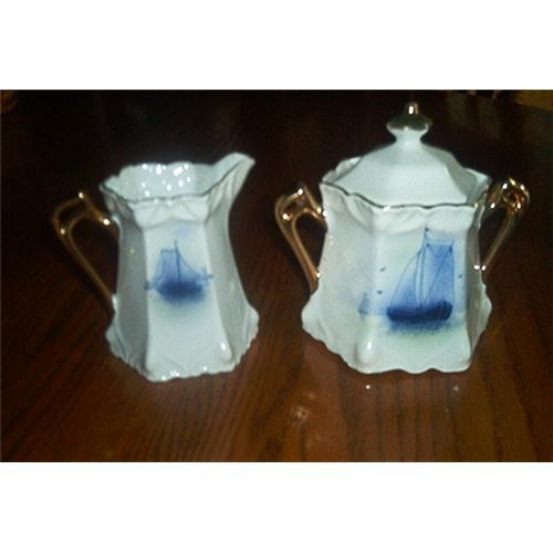 Twp-Piece, matching cream and sugar covered porcelain pieces. Both are Marked in orange on the bottom: GERMANY. Featuring cobalt blue sailing ships and decorated in gold, hand painted handles and trim around the tops. The lid on the sugar bowl features a gold painted knob. Both pieces are in excellent to mint condition. No chips, cracks, etc. The sugar bowl with lid measures 5 1/2 inches tall; opening diameter measures 3 1/4 inches; inside depth measures 3 inches; base measures 3 3/4 inches by 3 3/4 inches. The creamer measures 3 3/4 inches tall; opening diameter measures 3 inches long by 2 3/4 inches wide. Inside diameter measures 3 1/4 inches; Bottom base measures 2 7/8 inches by 2 77/8 inches. Both are in excellent to mint condition.