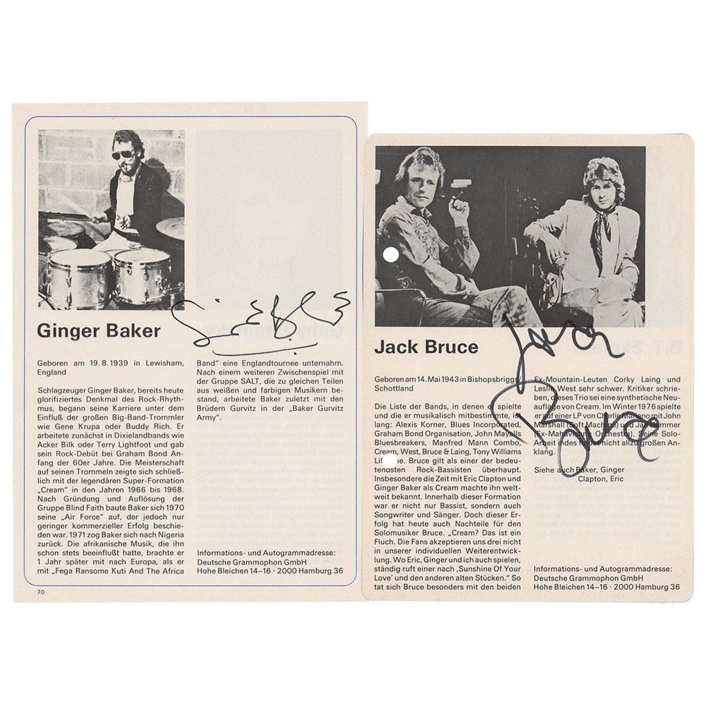 Two German-language book pages for Cream musicians Jack Bruce and Ginger Baker, 5 x 7 and 5.5 x 7.75, individually signed in black felt tip by the pictured rock star. In overall fine condition, with two punch holes to the Bruce page, which appears to have been evenly trimmed. Consignor notes that these signatures date to the 1980s.